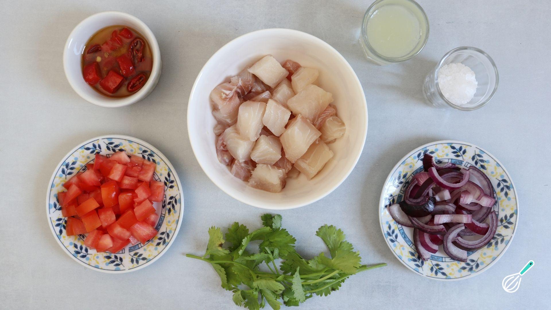 Comece separando e preparando os ingredientes: corte o filé de tilápia e o tomate em cubos e pique a cebola em meia lua. Esprema e coe o suco do limão e pique também o coentro.