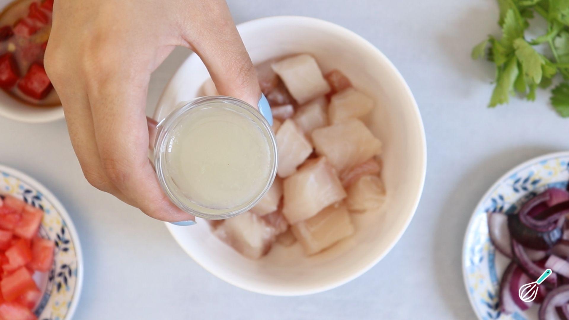 Agora vamos para o preparo: comece despejando o suco de limão na tilápia cortada em cubos e misture bem.