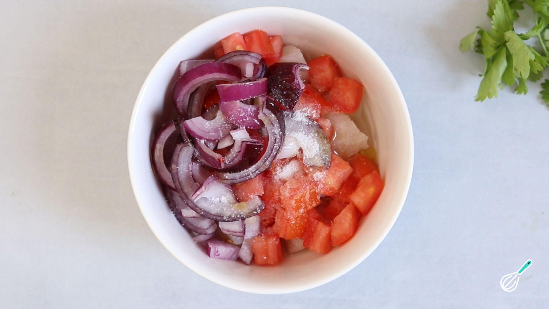Em seguida acrescente os demais ingredientes: cebola, tomate, coentro, sal e pimenta a gosto. Misture novamente e acerte o tempero se necessário.