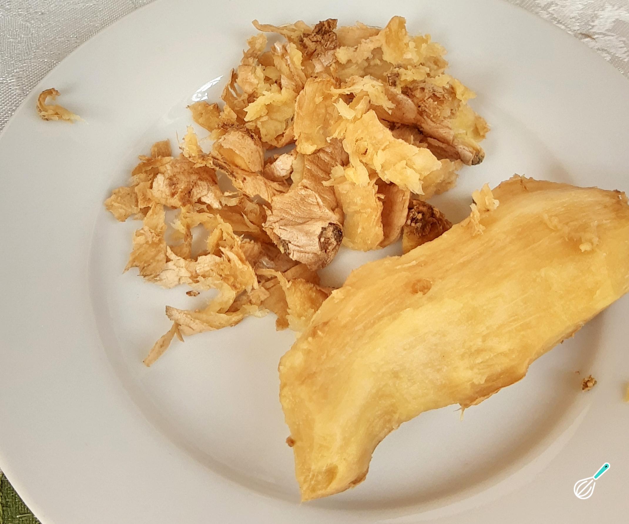 É muito fácil fazer água de hibisco com canela e gengibre. Para começar, descasque o gengibre simplesmente raspando a pele com a ajuda de uma colher ou faca. Separe uma rodela de gengibre com aproximadamente 2 dedos de espessura.