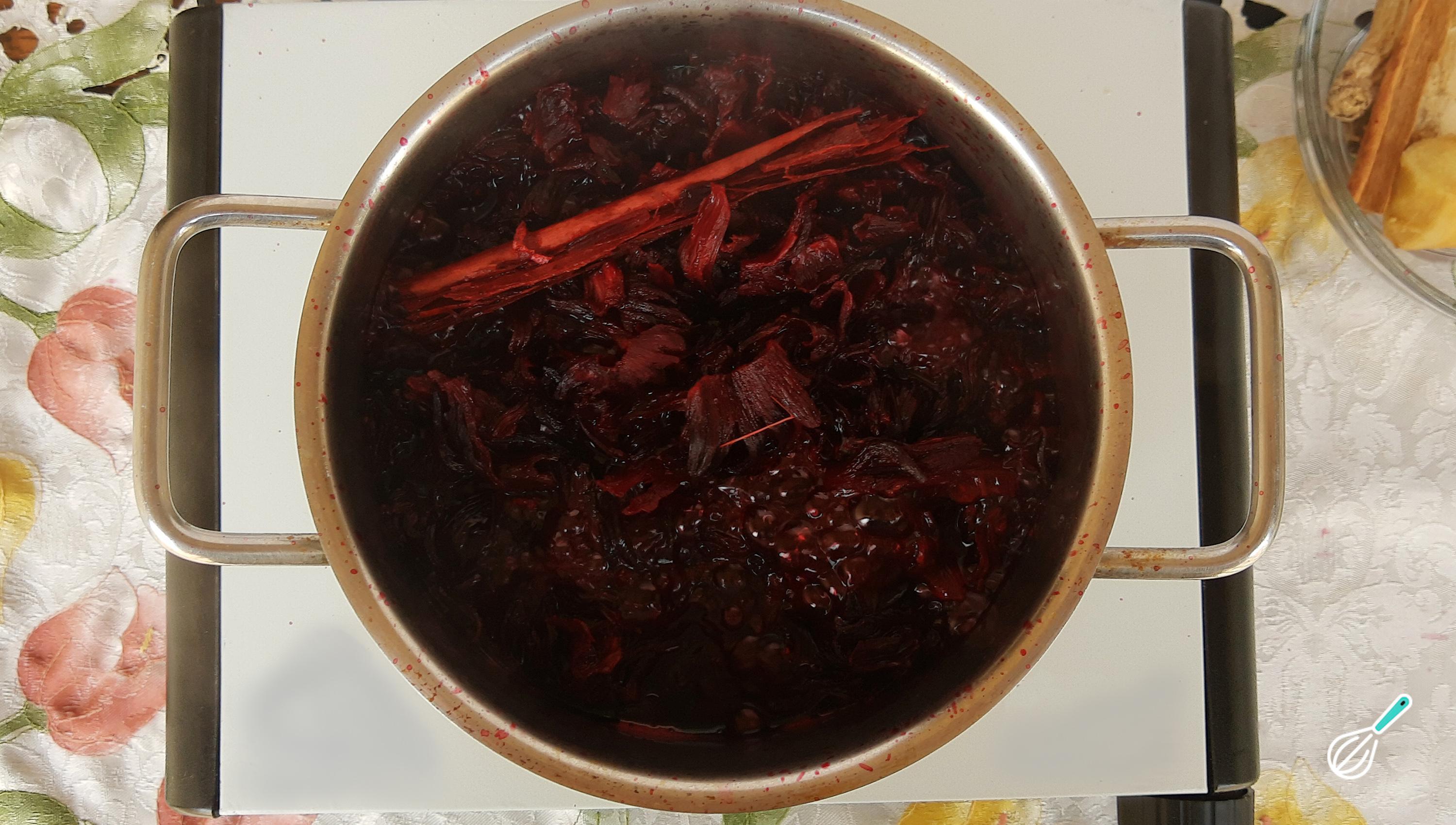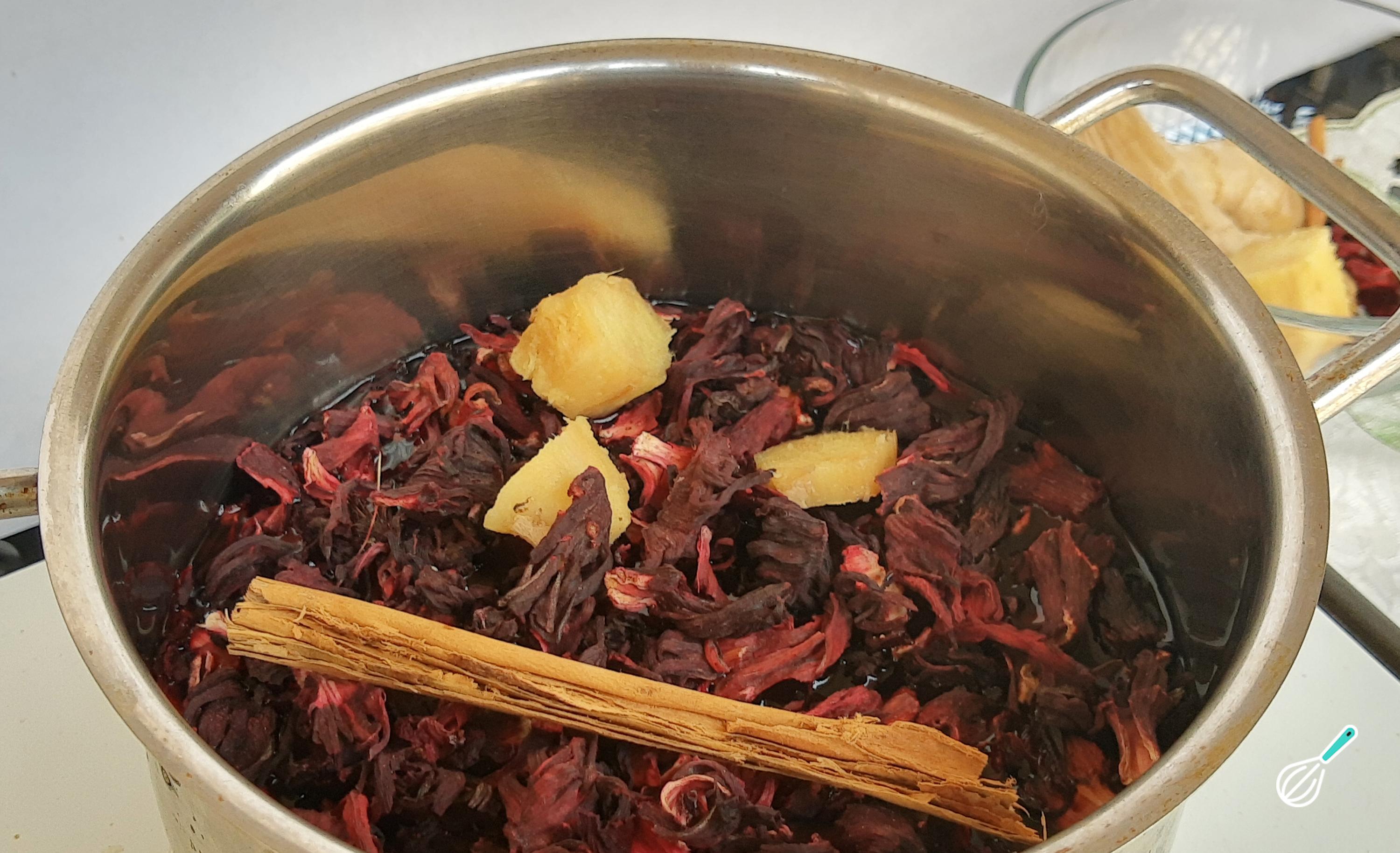 Esquente 1 litro de água numa panela no fogo alto e, quando começar a ferver, acrescente as flores de hibisco, a canela e o gengibre.