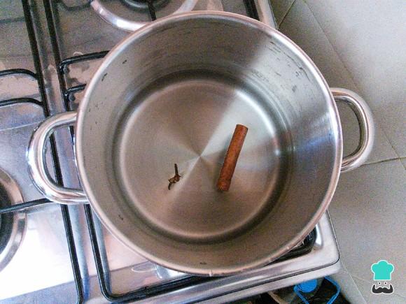 Para preparar este chá caseiro de morango coloque a água, a canela e os cravinhos em uma panela, e leve ao fogo médio por 10 minutos.