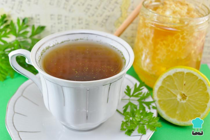 Após esse tempo, pode coar o chá ou tomá-lo com os pedaços de salsinha. Para aumentar as propriedades diuréticas, adicione no chá o suco do limão reservado e, se quiser, adoce com 1-2 colheres de chá de mel.