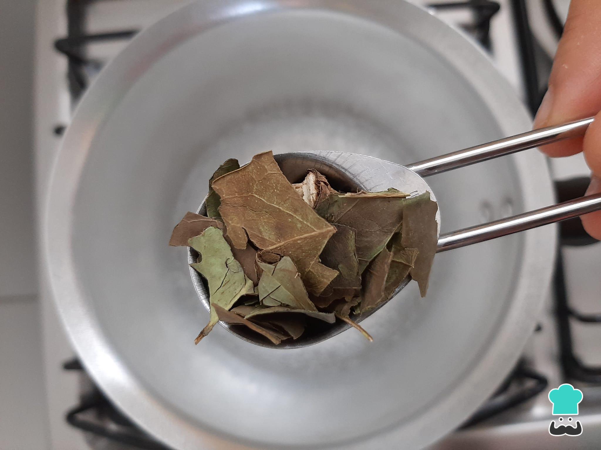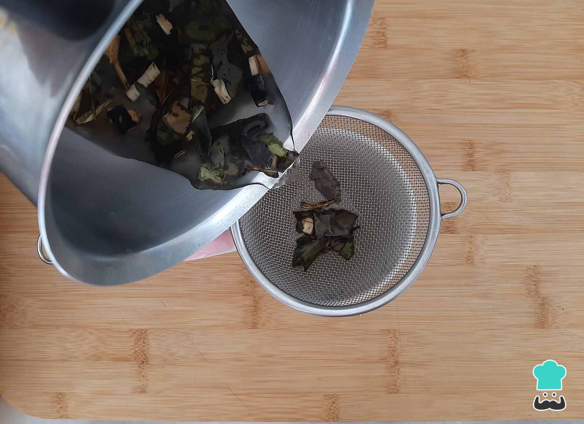 Após a infusão, coe o chá com uma peneira e descarte as folhas.