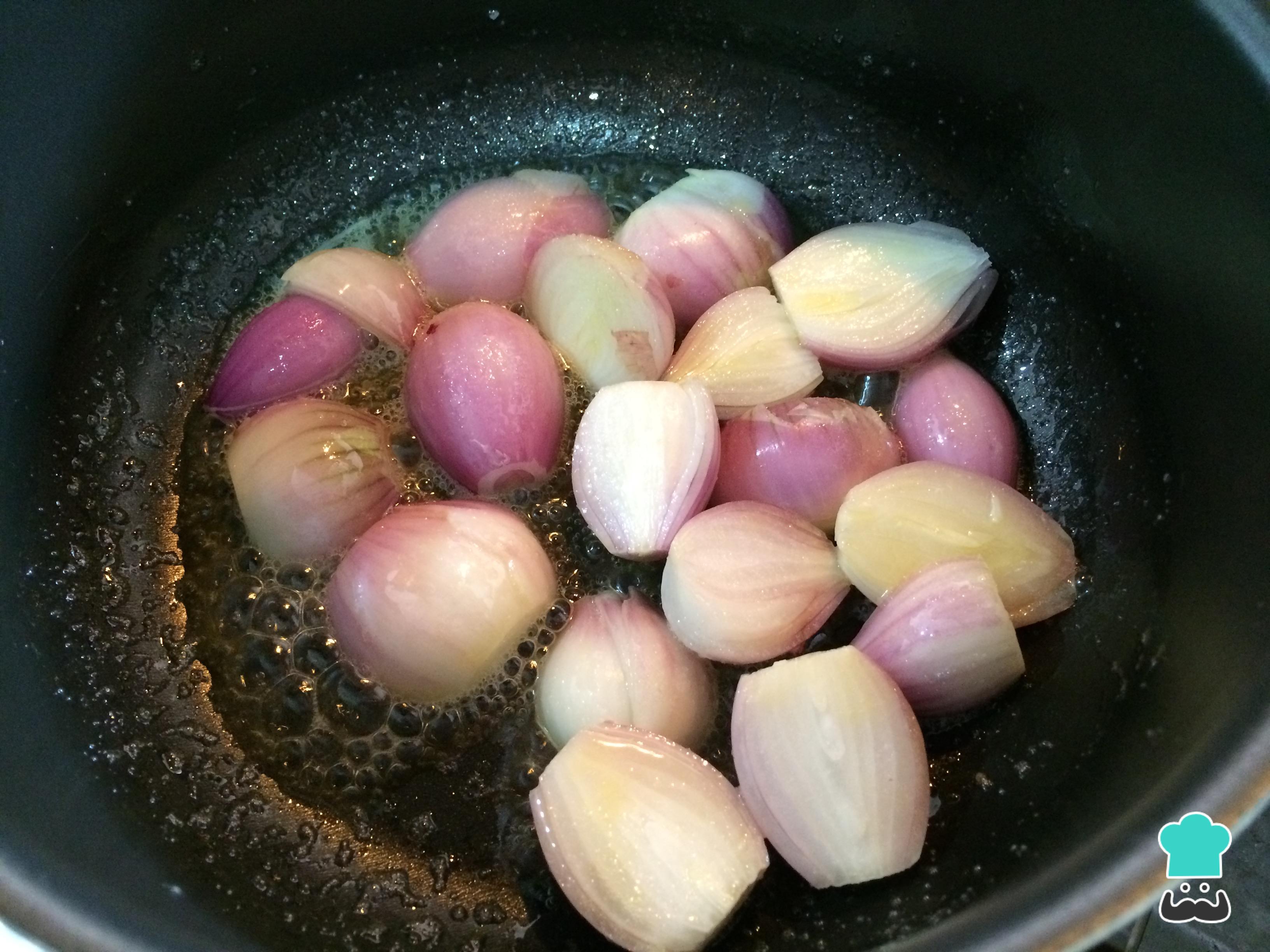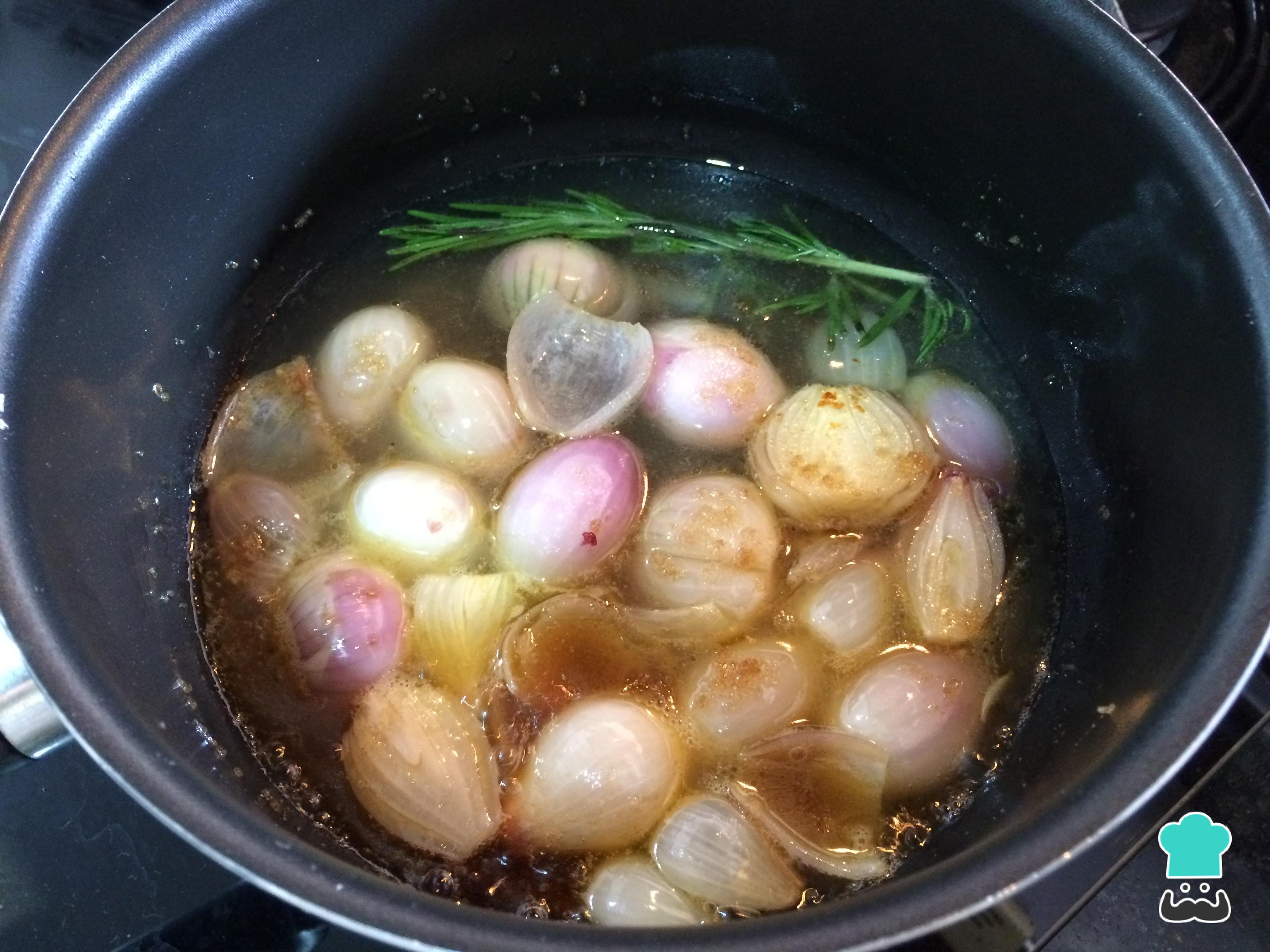 Acrescente um pouco de água e o ramo de alecrim, e deixe cozinhar as chalotas em fogo baixo, até que o líquido reduza.