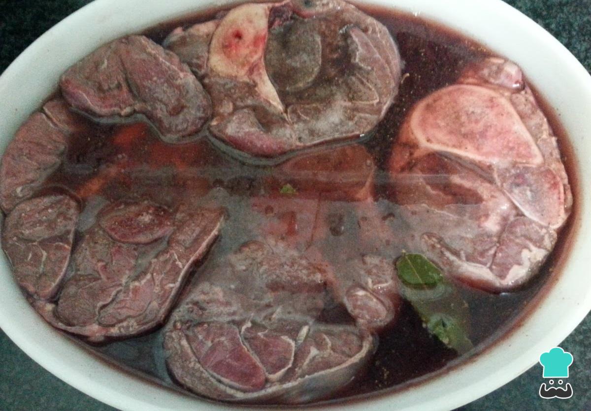 Para cozinhar chambaril na panela de pressão, aconselhamos que deixe a carne marinando por uma noite. Para isso coloque-a em uma tigela ou saco de plástico, acrescente a cebola, os alhos, a pimenta, o vinho e o louro, e reserve na geladeira.