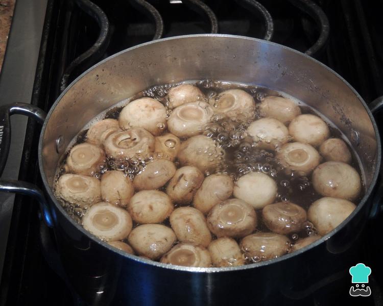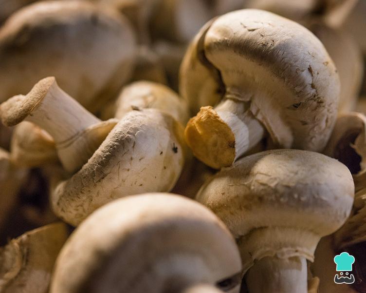 Comece por limpar muito bem os cogumelos. Para isso use um pano úmido e esfregue suavemente os cogumelos com ele, para remover os vestígios de terra e outras sujeiras. Corte a parte escura dos pés e, se quiser, corte os cogumelos pela metade.