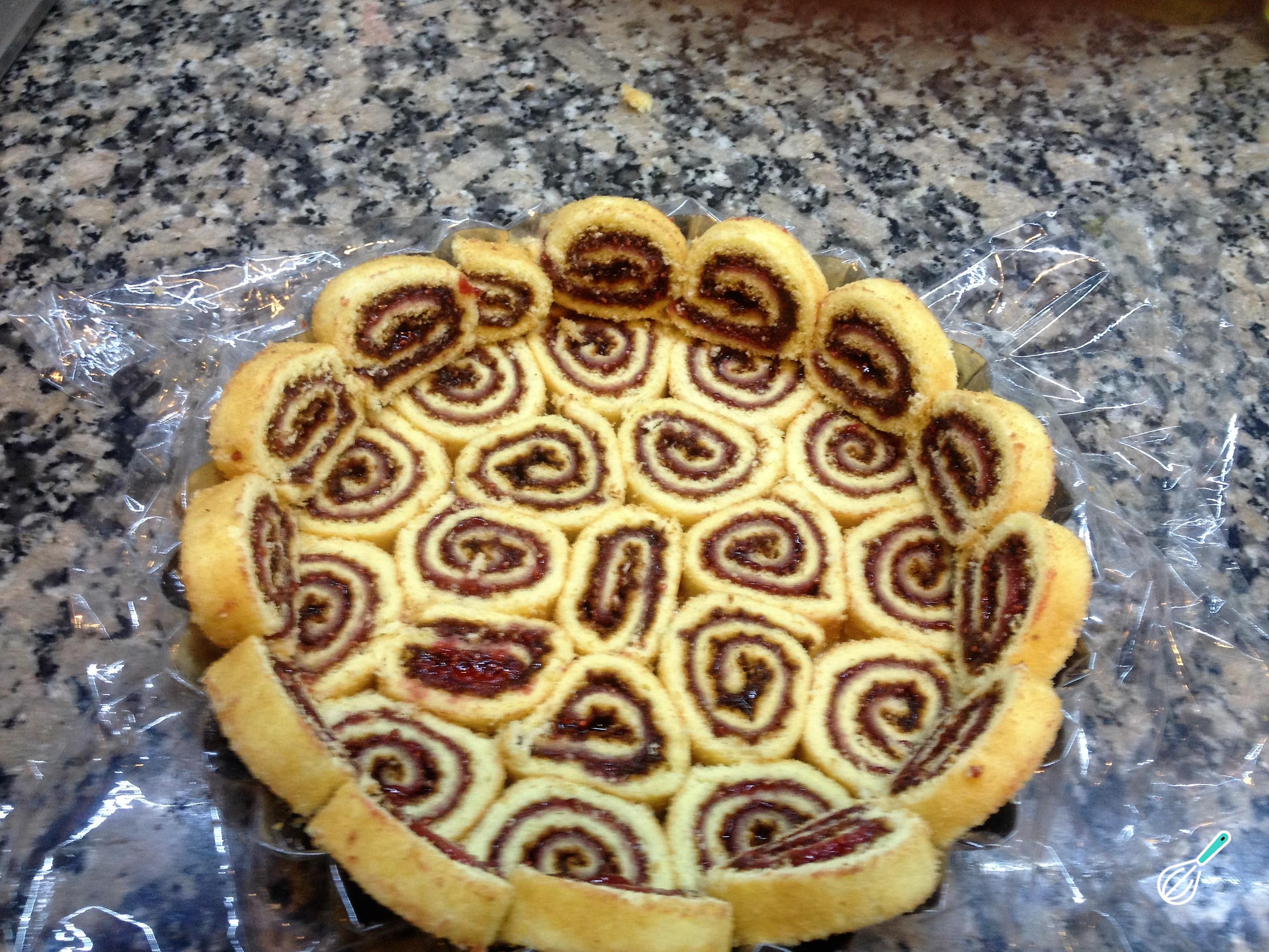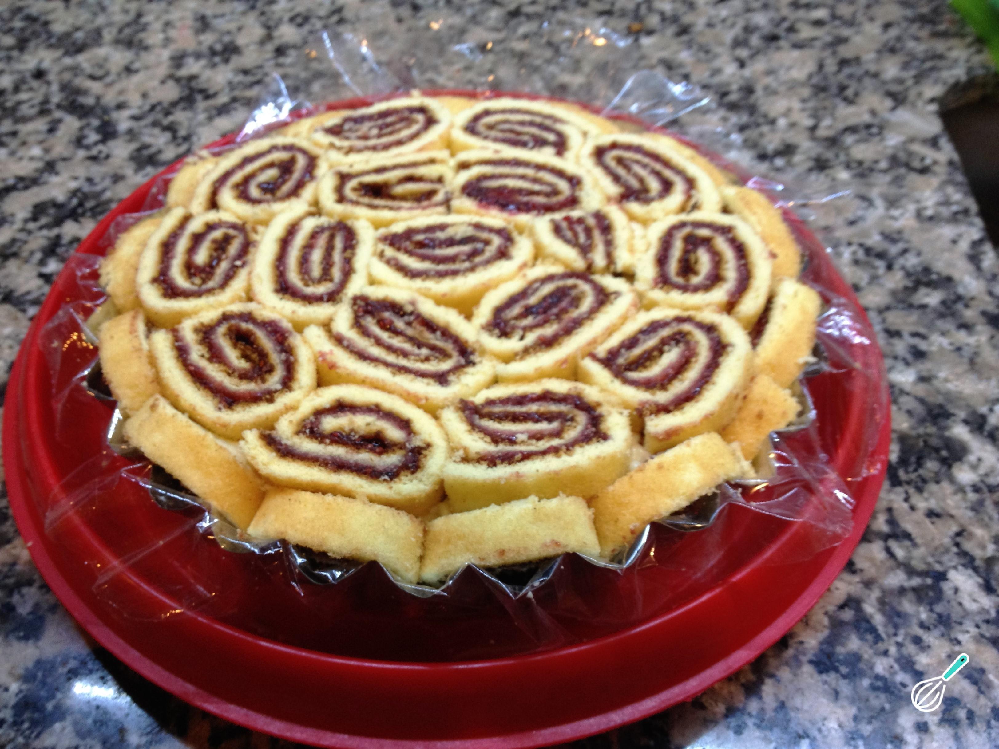 Forre a forma que vai usar (no meu caso mede 22 cm) com papel filme (depois é mais fácil desenformar). Em seguida, unte o rocambole com a geleia e corte-o em fatias, usando-as para cobrir o fundo e as laterais do molde de Charlotte.