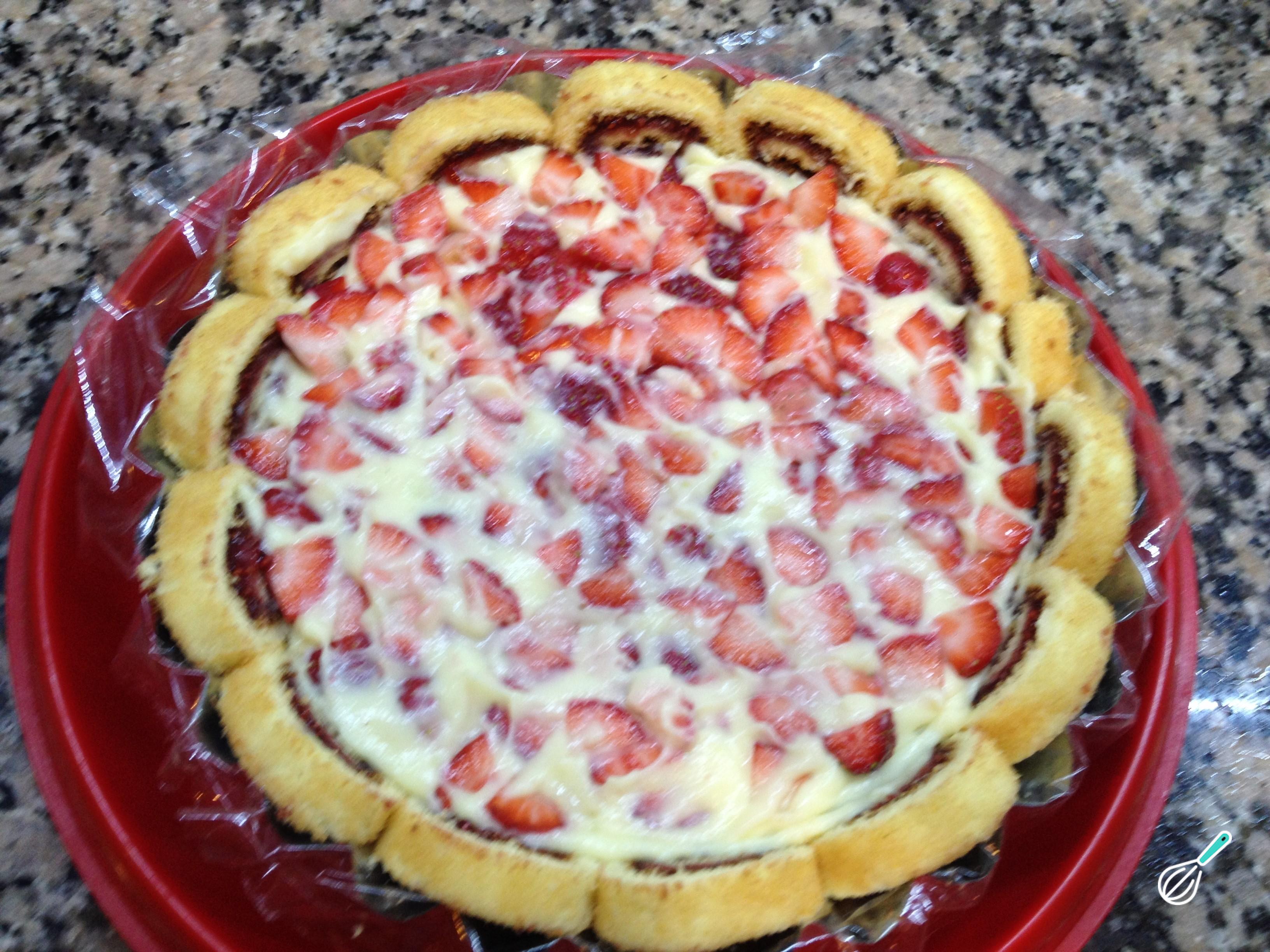 Em seguida, desenforme a carlota com molho de morangos para o Porto decore com alguns morangos do molho previamente coados para não molhar o rocambole.