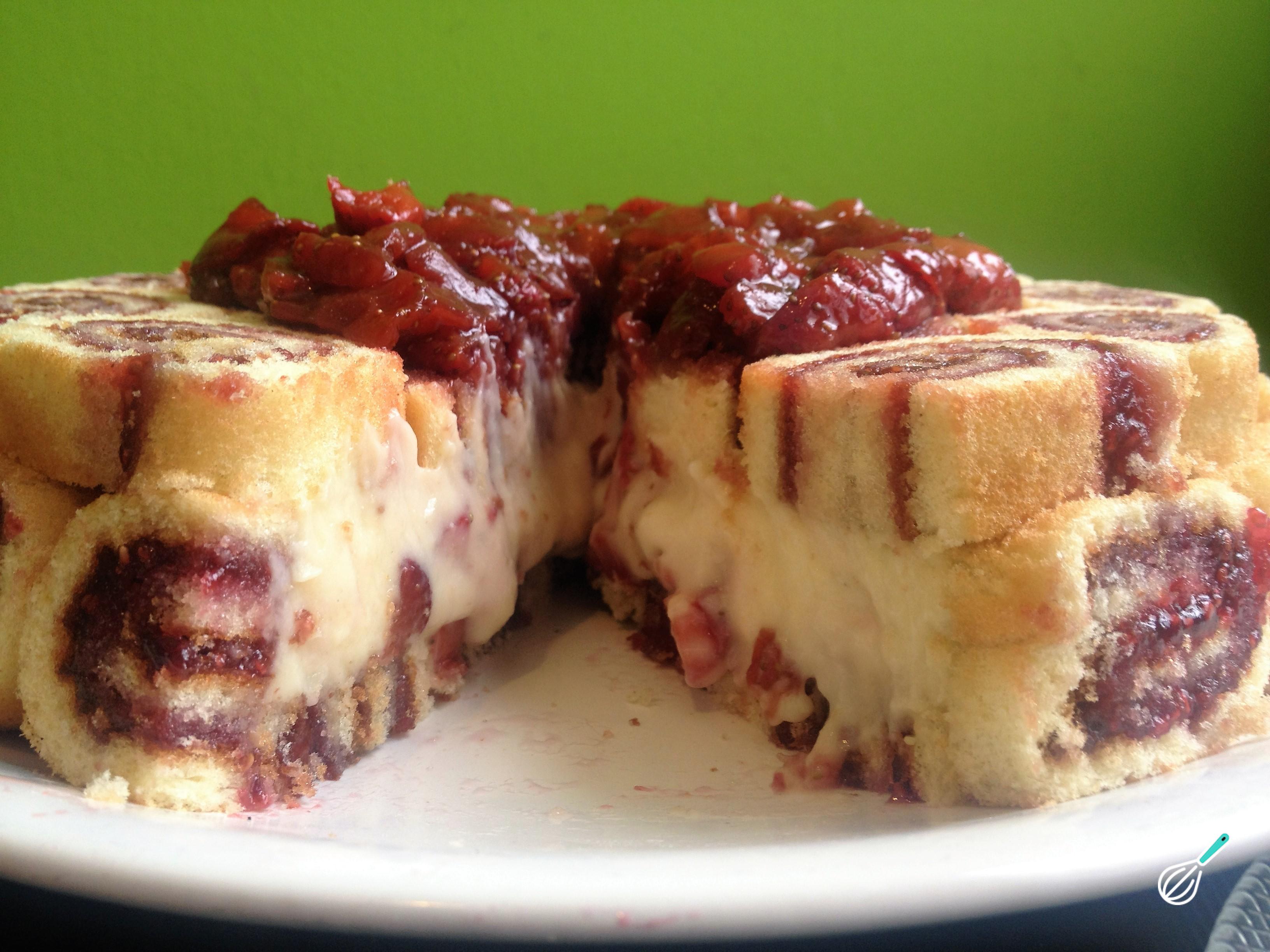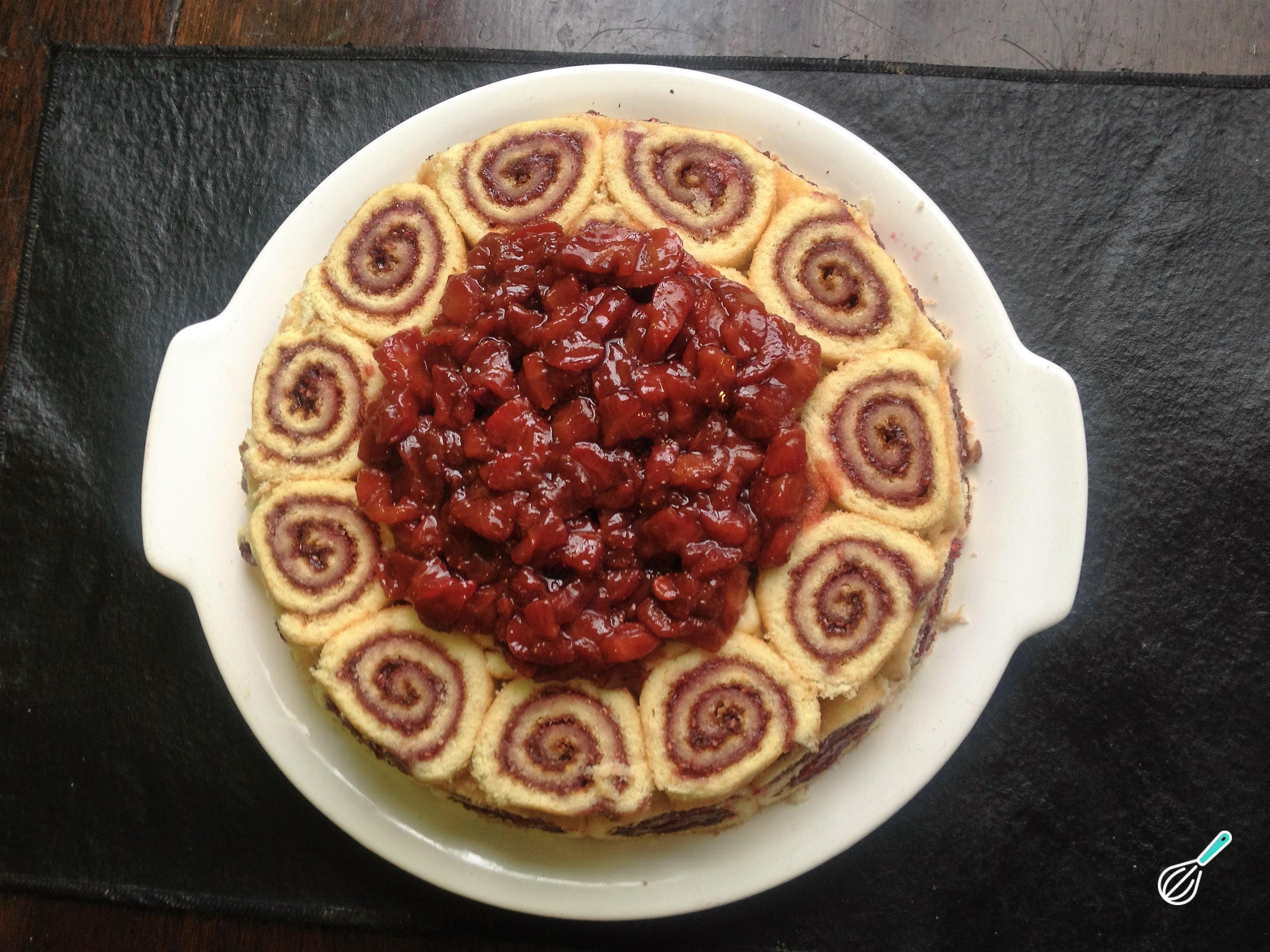 Finalmente, cubra a torta com o molho de morango e mais fatias de rocambole. Em seguida, cubra com filme plástico e leve à geladeira por, pelo menos, 6 horas. Quanto mais horas a Charlotte com vinho do Porto ficar esfriando, melhor.