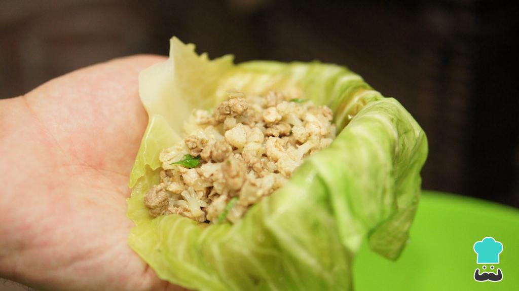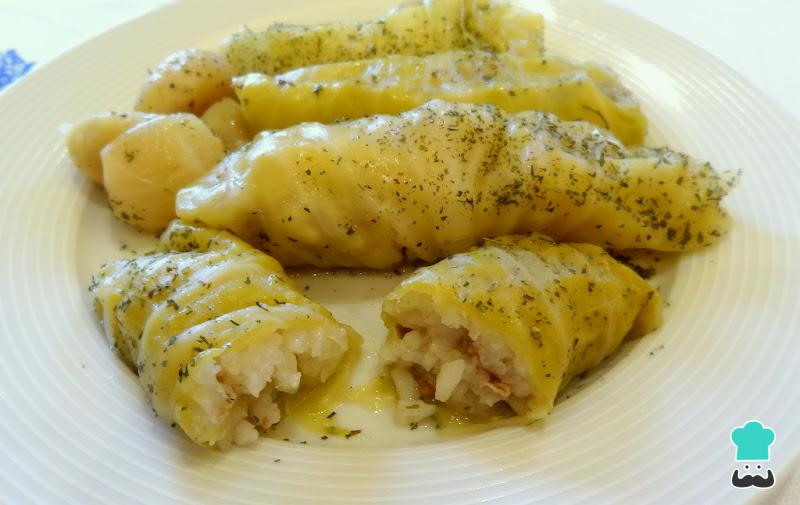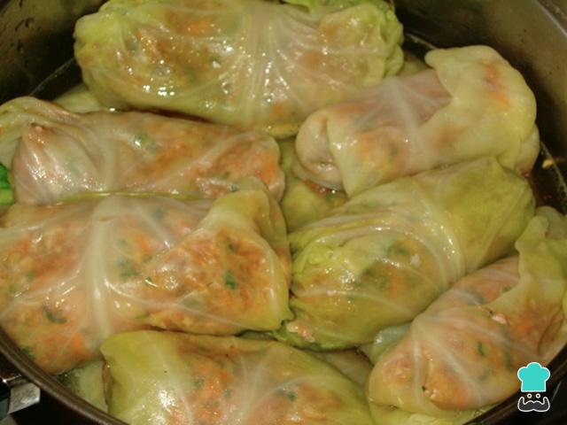 Recheie as folhas de repolho com o preparado anterior e embrulhe bem (se necessário amarre cordel barbante ou prenda palitos de dente).