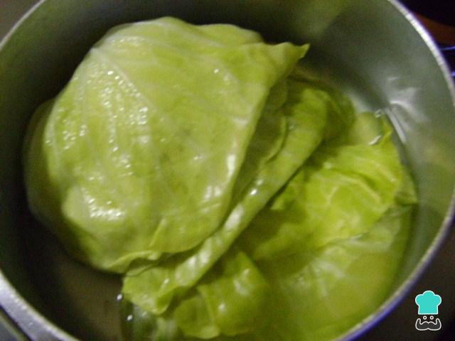 Para preparar esta receita de charuto de repolho com frango comece por ferver as folhas de repolho em uma panela com água e um pouco de sal durante cerca de 5 minutos. Retire e reserve a água.