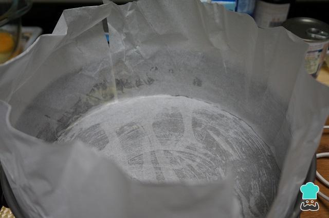 Em seguida unte com manteiga e forre com papel manteiga uma forma de bolo de 22 cm sem furo central.