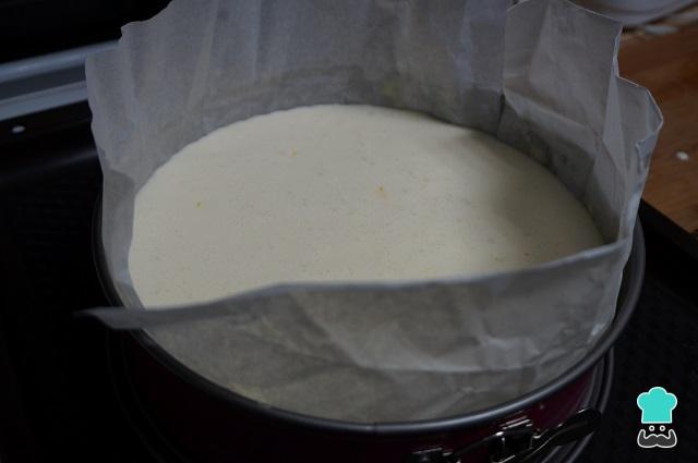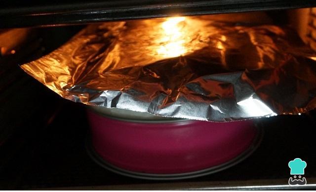 Cubra o cheesecake fácil com papel alumínio e leve a assar no forno a 180ºC com calor em cima e em baixo. Após 10-15 minutos retire o papel alumínio e deixe o cheesecake terminar de assar por mais uns 50-60 minutos (faça o teste do palito: ele deverá sair limpo).