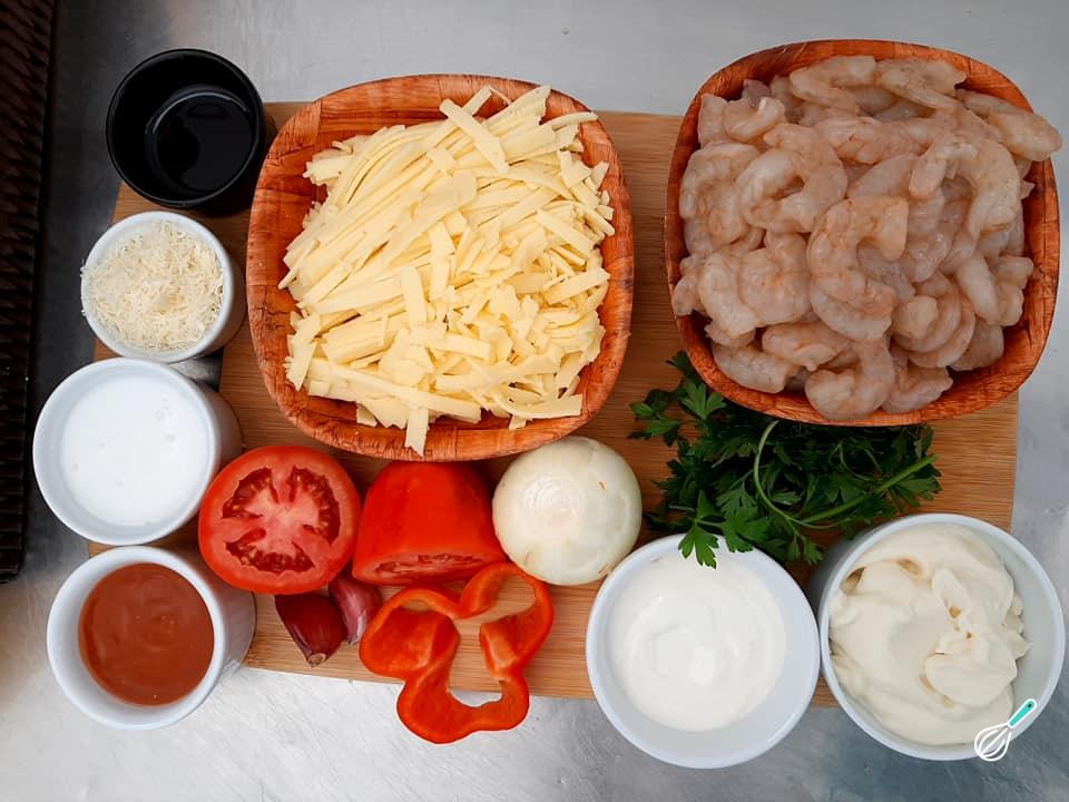 Comece separando todos os ingredientes, lembrando que antes precisará limpar os camarões, retirando as cabeças, cascas e caldas (que poderão ser usadas para o preparo de caldos posteriormente).