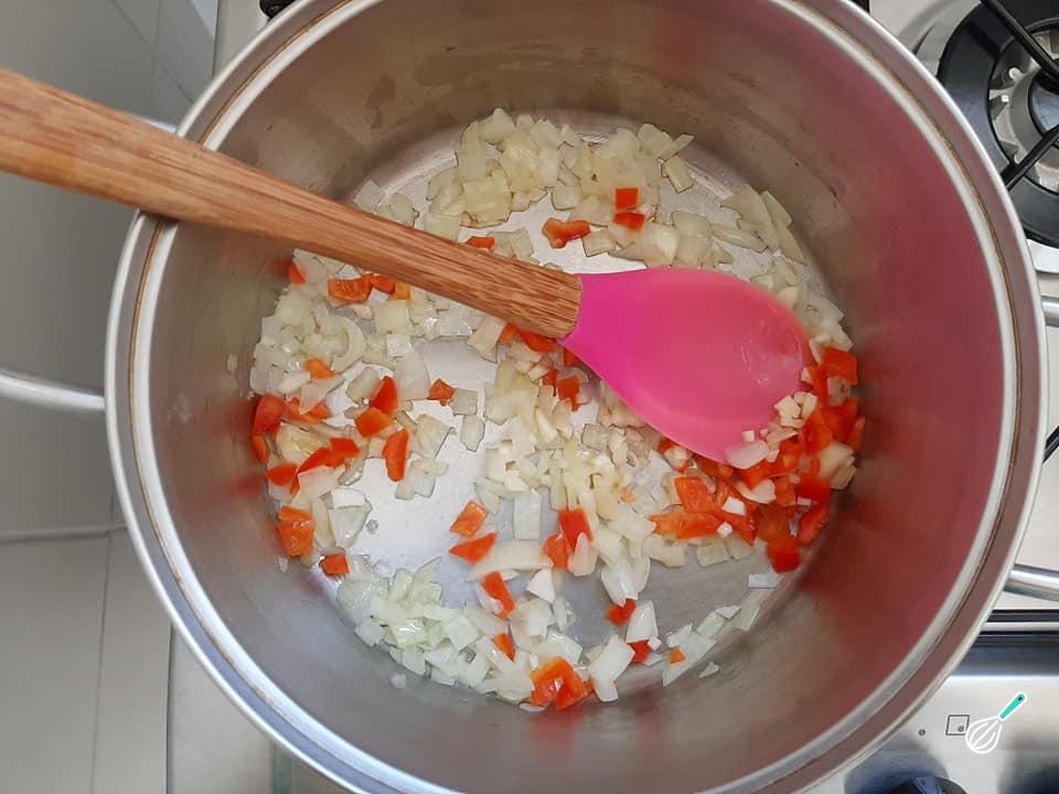 Aqueça o azeite de oliva na panela e refogue a cebola. Em seguida, acrescente o alho e o pimentão picados, refogando mais um pouco.
