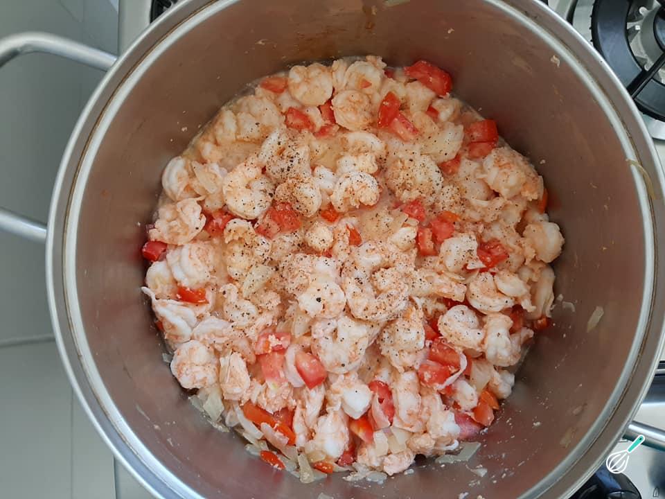 Adicione o tomate e os camarões, refogando por uns 5 minutos, até que os camarões fiquem levemente rosados.