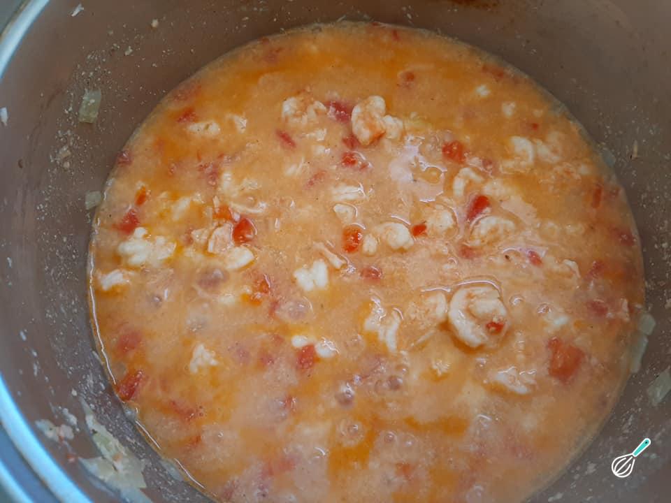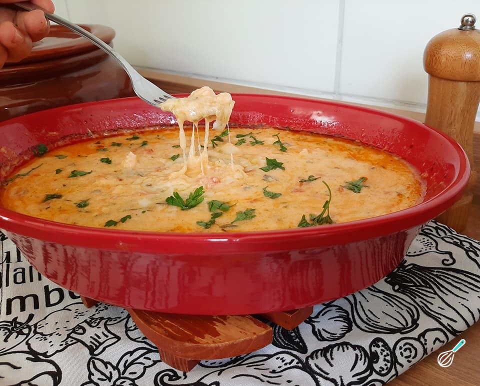 Retire o chiclete de camarão da panela e despeje numa travessa. Nesse momento esse caldo de camarão já estará bem cremoso, mas ficará ainda melhor se você colocar o restante do queijo muçarela por cima e levar ao forno pré aquecido a 180-200 graus para gratinar até dourar levemente.