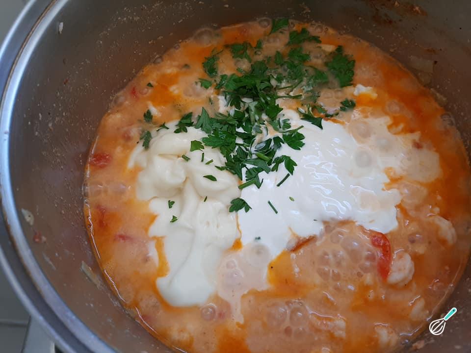 Para continuar preparando este camarão cremoso acrescente agora o leite de coco, o requeijão cremoso e o cheiro verde picado. Misture bem e deixe cozinhar por mais alguns minutos.