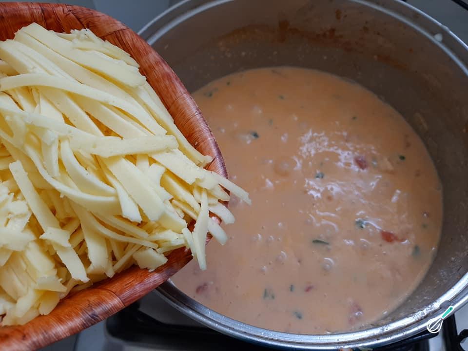 Acrescente um pouco mais da metade do queijo muçarela na panela e mexa sempre até o queijo derreter por completo.