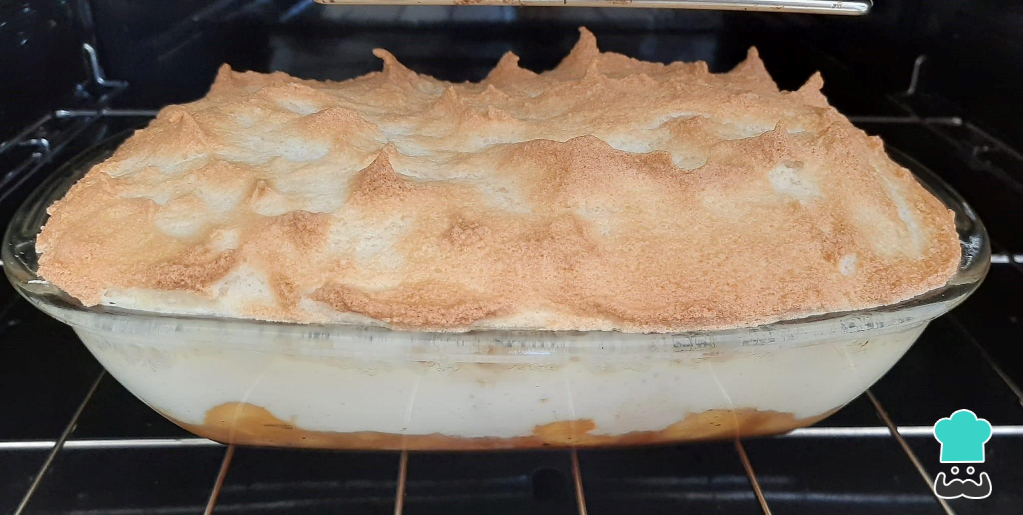 Por último, cubra o creme com o merengue e, com o auxílio das costas de uma colher, tente fazer ondas, levantando o merengue suavemente para dar um efeito bonito ao mesmo.
