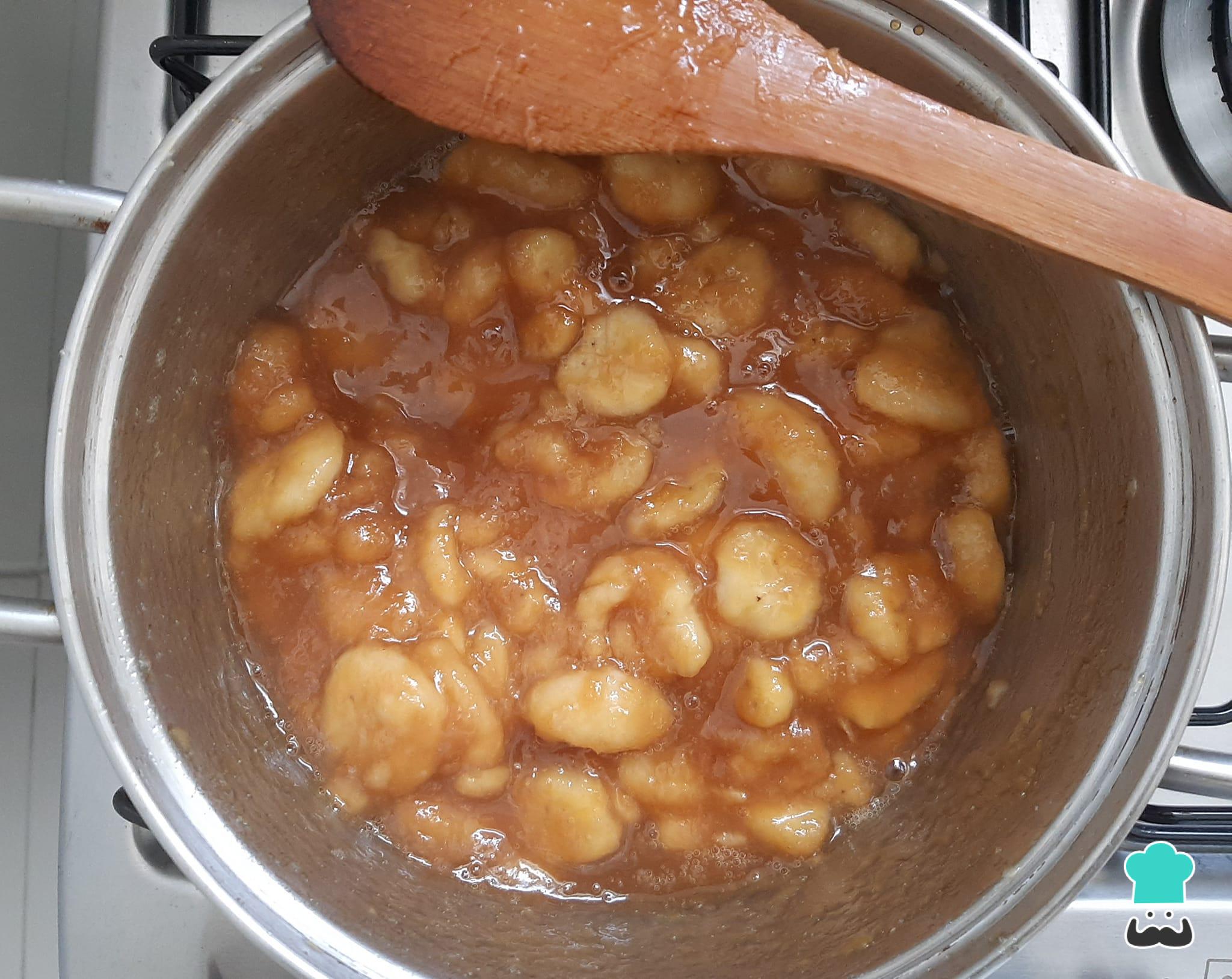 Após isso, adicione as rodelas de bananas ao caramelo e deixe-as cozinhando por uns 5 minutos, mexendo apenas de vez em quando. Reserve.