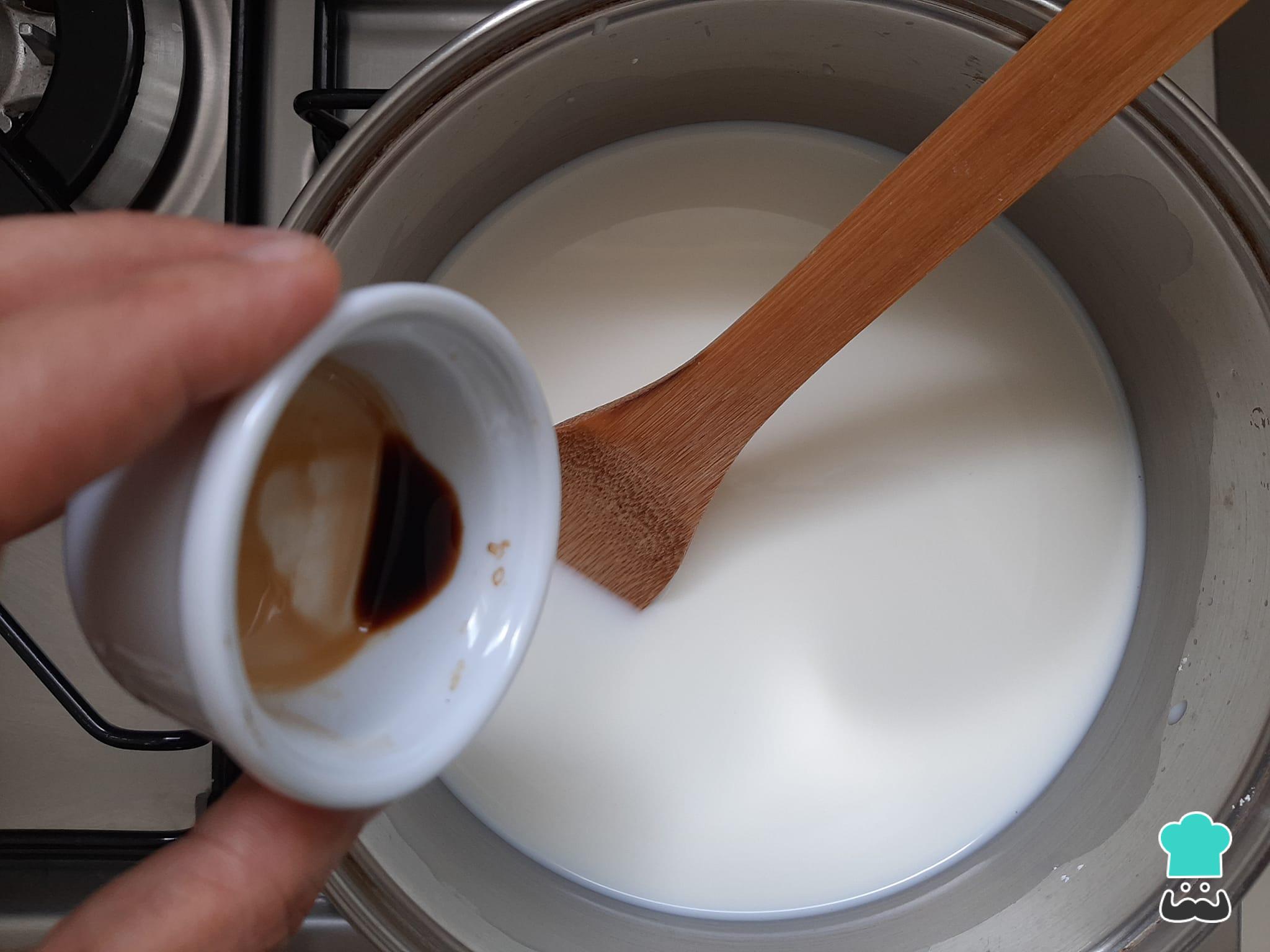 Em seguida prepare o creme de gemas: numa panela média misture o amido de milho ao leite até que fique totalmente diluído. Adicione o açúcar e as gotas de essência de baunilha, misturando bem.