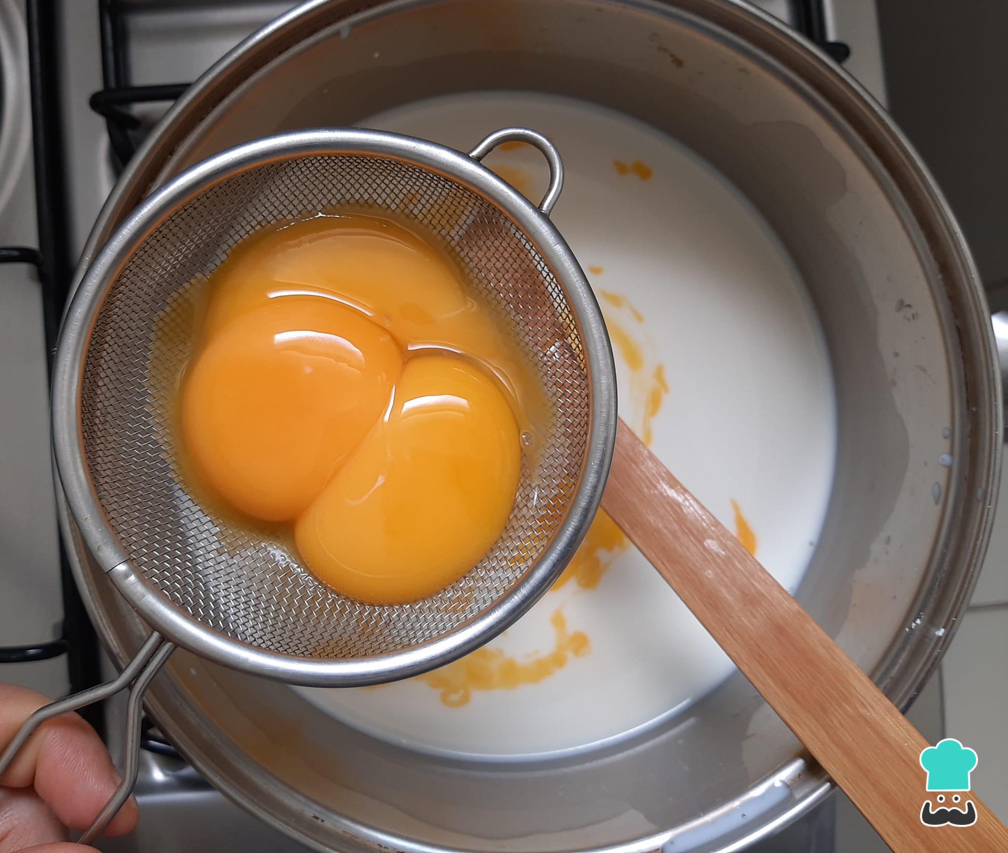 Acrescente as gemas de ovos, passadas por uma peneira (esse é um truque para reduzir o gosto e cheiro de ovo nesta sobremesa).
