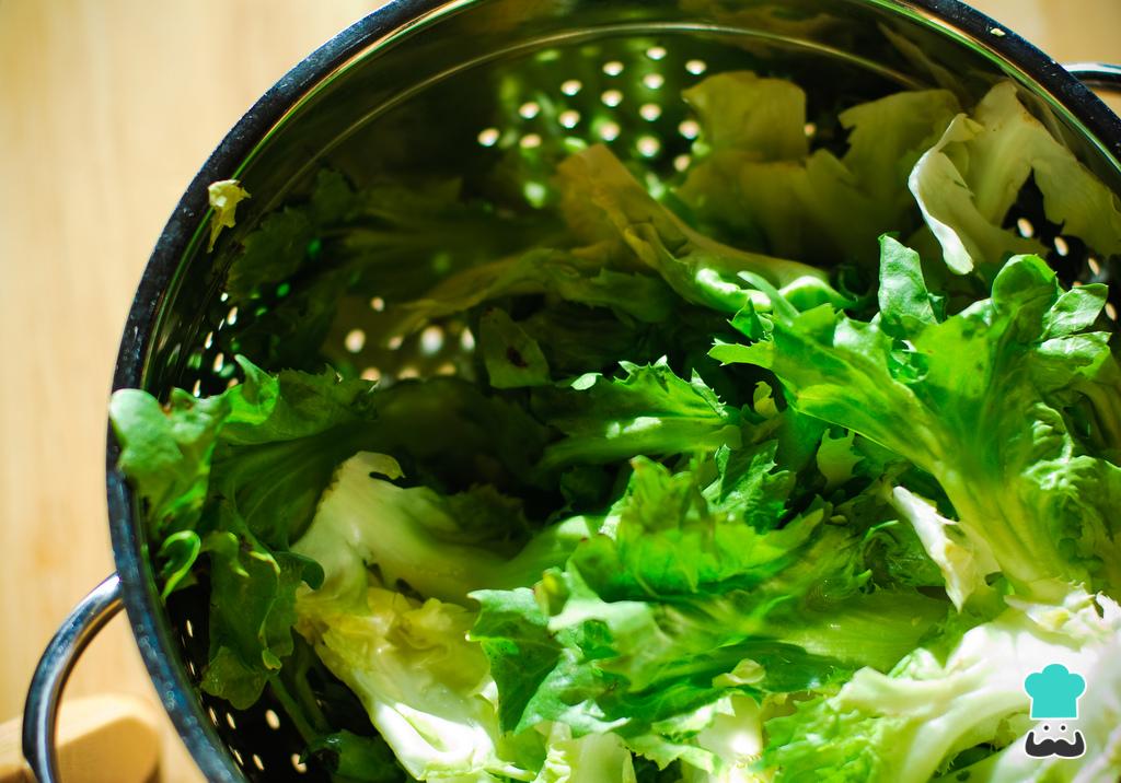O primeiro passo dessa receita com chicória é lavar muito bem as folhas. Depois coloque-as sobrepostas em uma tábua de cozinha e corte em tiras mais ou menos finas.