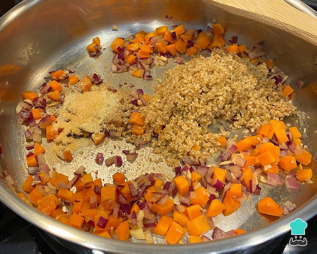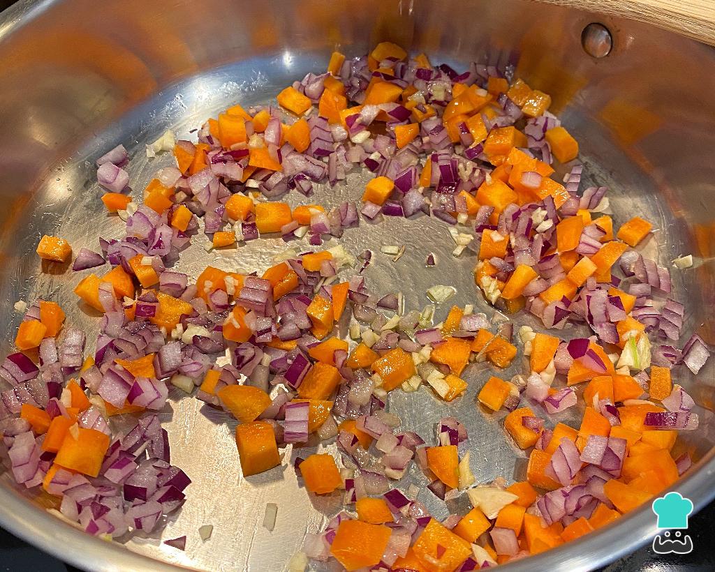 Numa panela ou frigideira funda aqueça o óleo e refogue a cebola, o alho e a cenoura, até tudo ficar macio (uns 5 minutos).