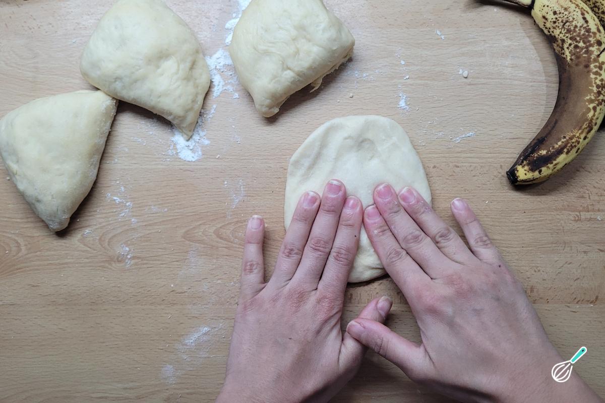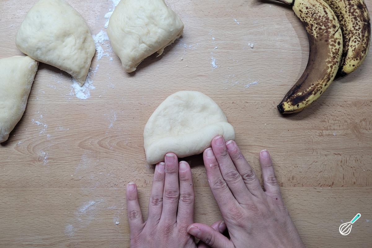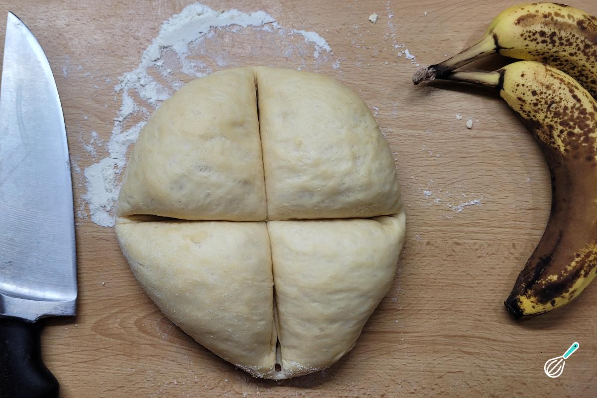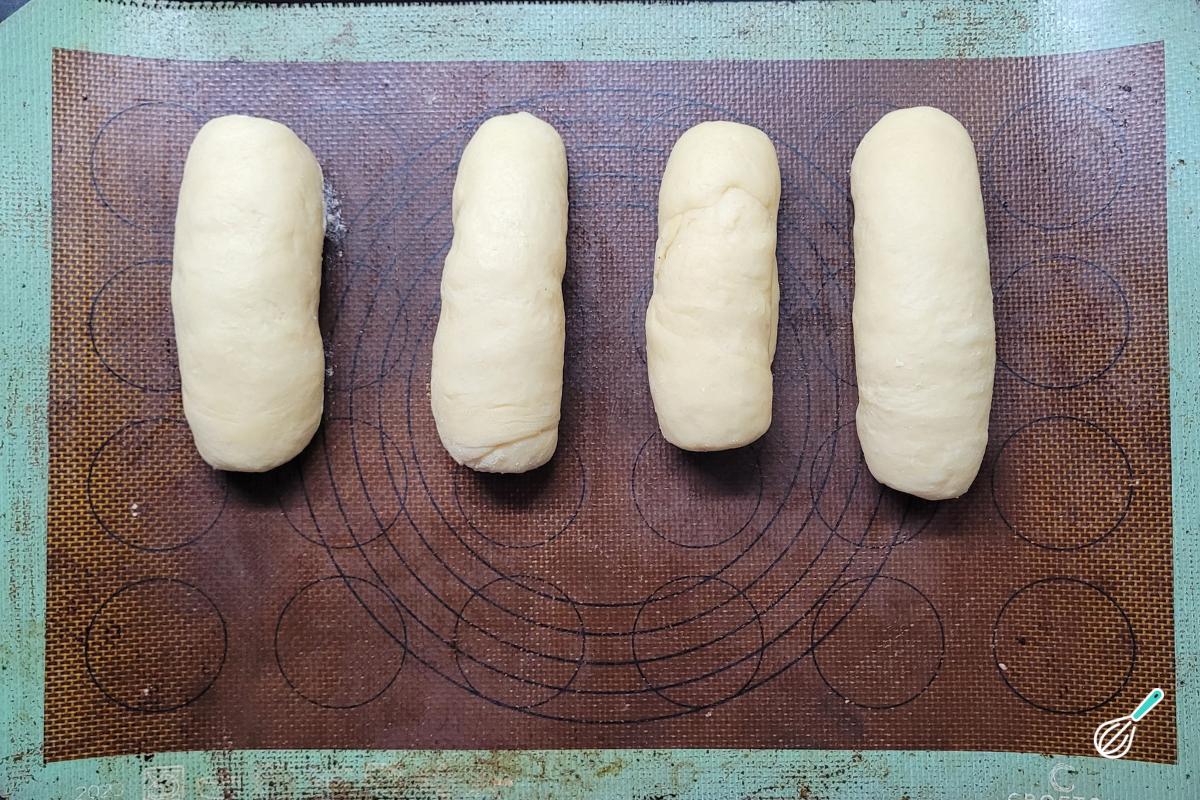 Quando a massa tiver crescido, transfira para a bancada enfarinhada e corte em quatro partes iguais, de cerca de 100 gramas cada.