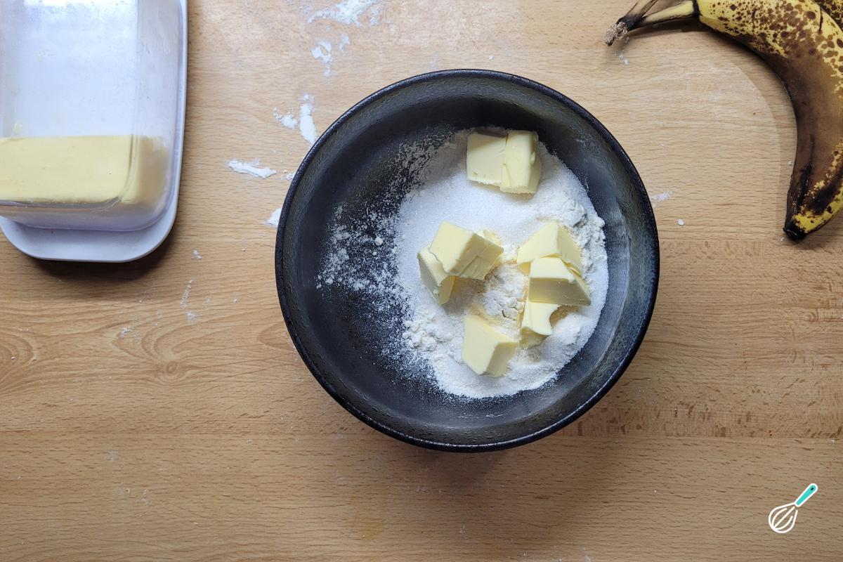 Enquanto isso, prepare a farofa. Misture a farinha, o açúcar e a manteiga gelada em cubos em uma tigela. Para a farofa, é importante que a manteiga esteja gelada, porque é isso que garante a crocância.