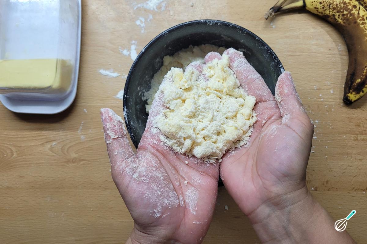 Com as pontas dos dedos, vá quebrando a manteiga até chegar em uma textura de farofa ou areia molhada e reserve.