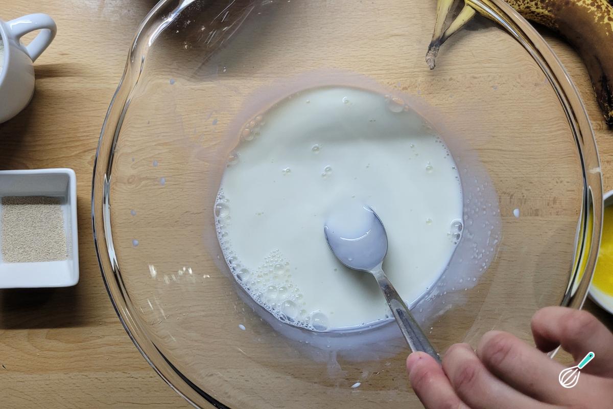 Vamos começar pela massa porque ela precisa descansar para crescer. Em uma tigela, misture o leite morno com o açúcar. Cuidado com a temperatura do leite: é importante que esteja morno para ajudar na ativação do fermento, mas não deve estar muito quente para não matar o fermento.