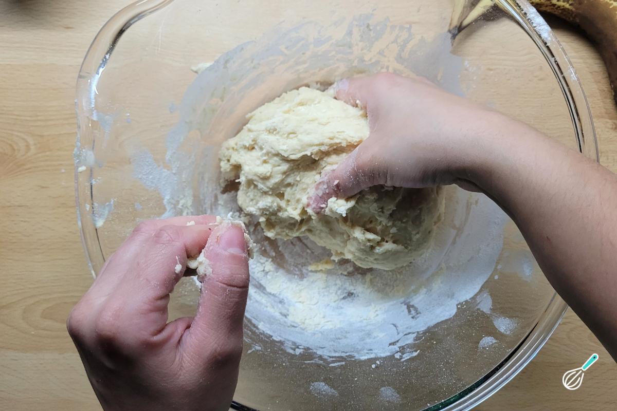 Depois, misture com as mãos até que toda a farinha tenha sido incorporada e consiga modelar.
