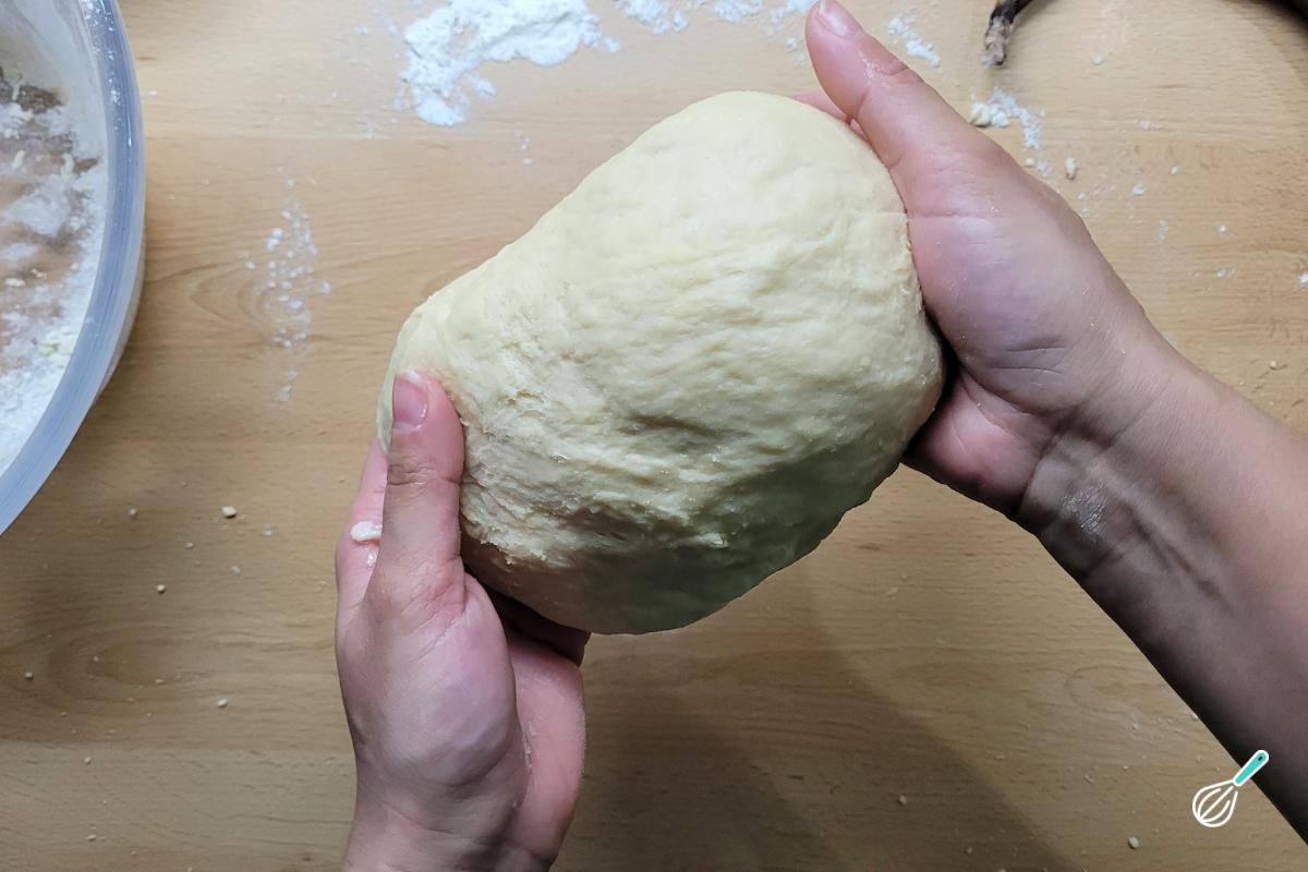 Transfira a massa para a bancada enfarinhada e sove até que a massa esteja lisa e elástica. Durante o processo, se a massa estiver muito grudenta, adicione um pouco de farinha, mas sempre aos poucos para que a massa não fique pesada.