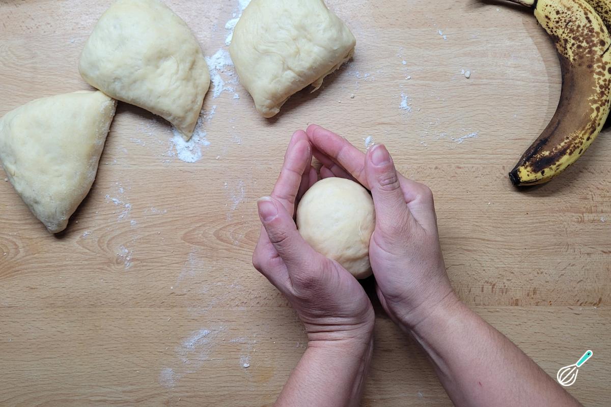 Disponha os pãezinhos modelados em uma assadeira untada ou com papel manteiga, deixando um espaço entre eles porque ainda vão crescer um pouco. Cubra e deixe crescer por mais uns 15 minutos.