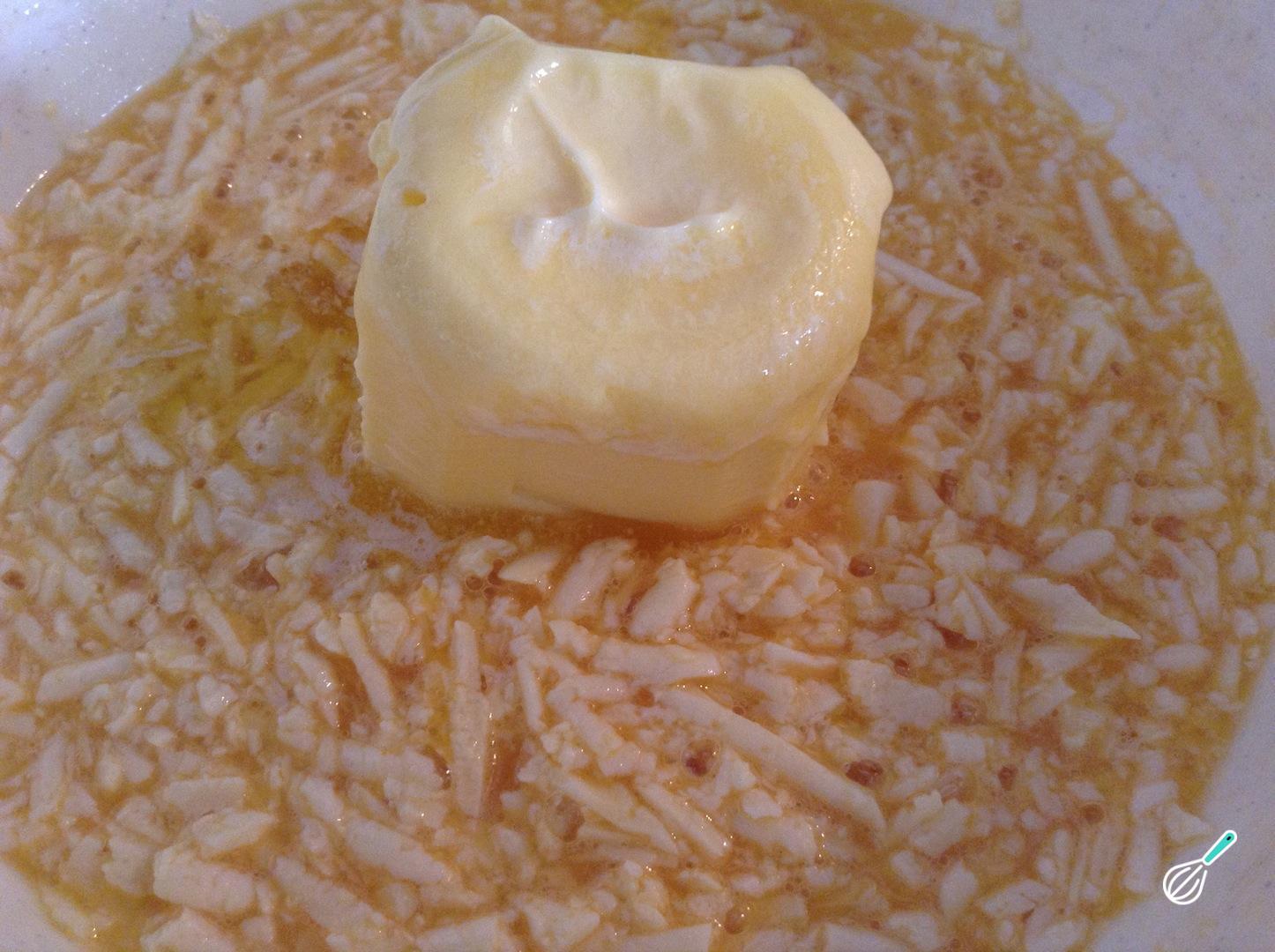 Coloque os ovos e o queijo previamente ralado em uma tigela com o sal. Adicione a manteiga amolecida e misture tudo.