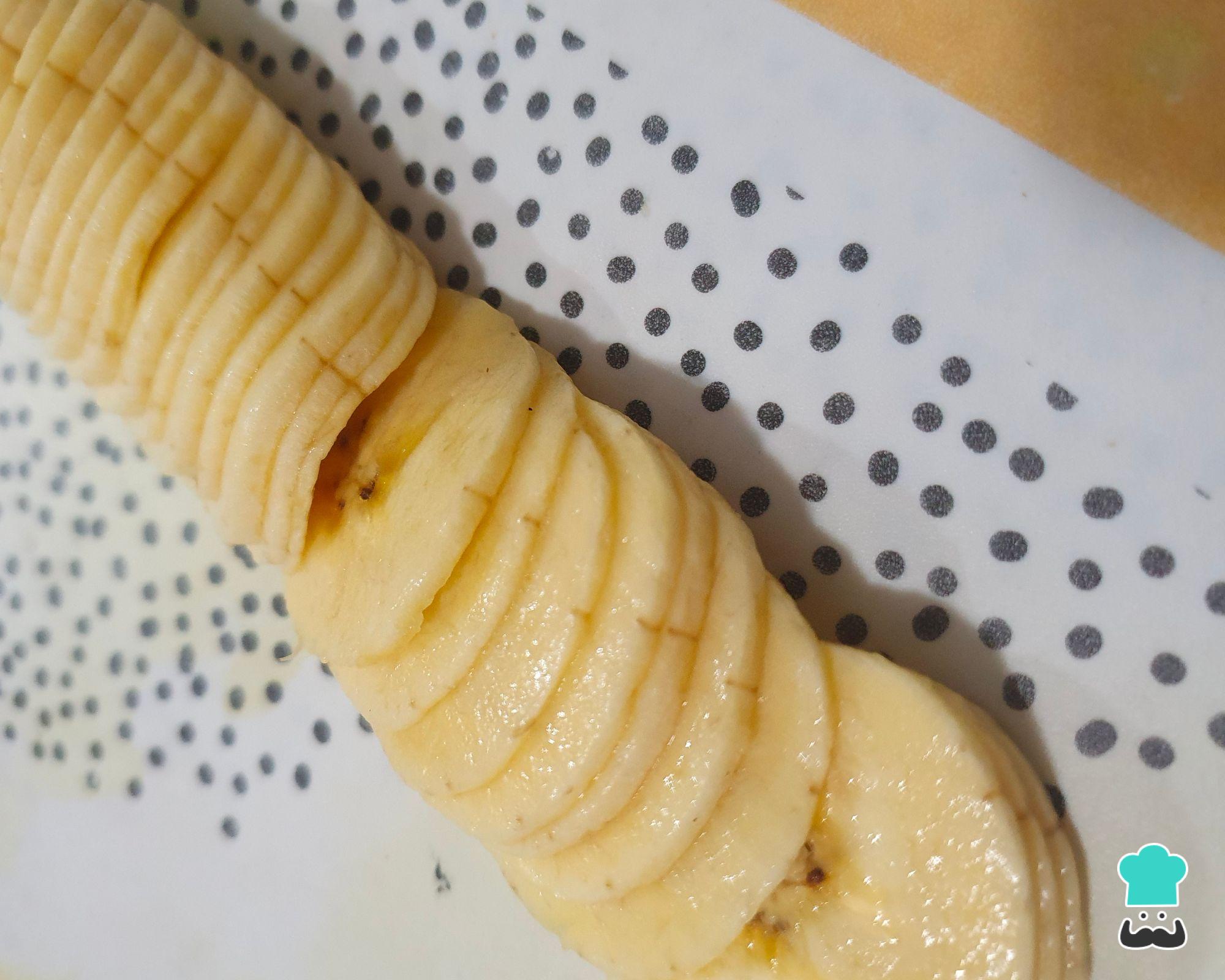 Descasque as bananas e corte em fatias bem fininhas.