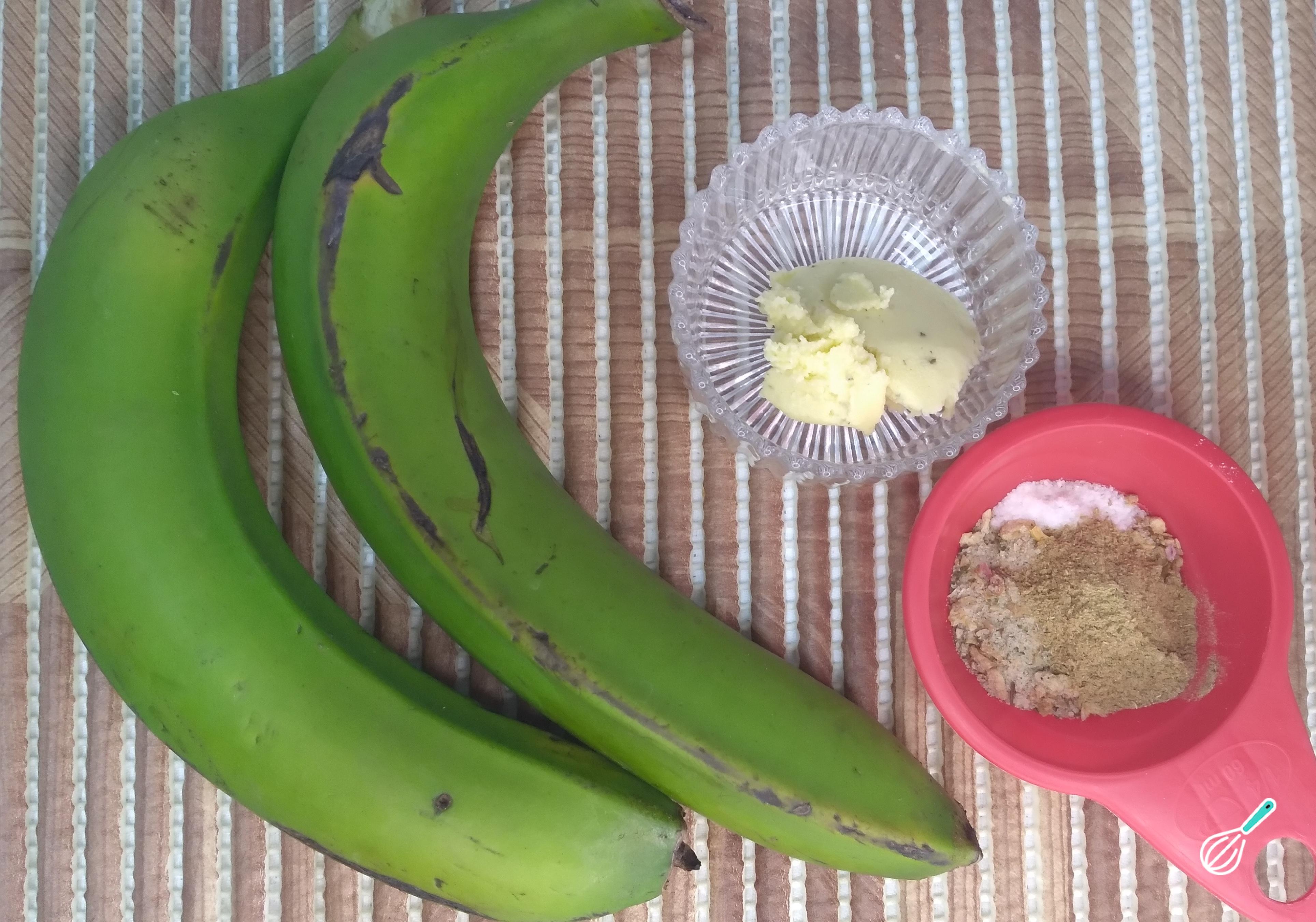 Reúna os ingredientes para o preparo da receita. A banana d'água deve estar bem verde. Quanto mais verde, melhor será para ser trabalhada e o sabor estará mais neutro aceitando assim os temperos que preferir usar. Separe os temperos que goste e o sal. Usei manteiga de coco, mas poderá ser substituída pelo óleo de coco.