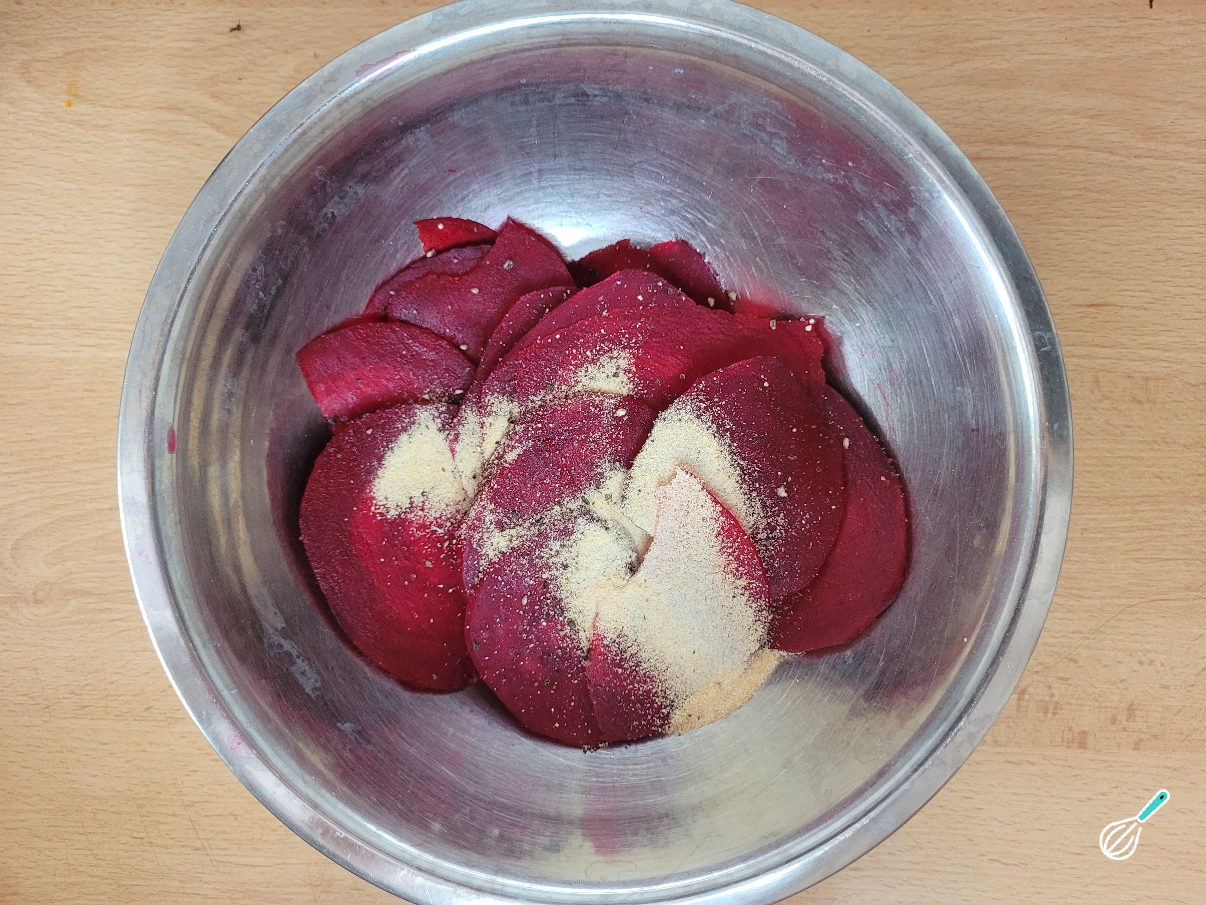 Coloque as fatias de beterraba em uma tigela e adicione os temperos que preferir. Aqui usei sal, pimenta do reino e alho em pó. Misture bem com as mãos para envolver todas as fatias com os temperos.
