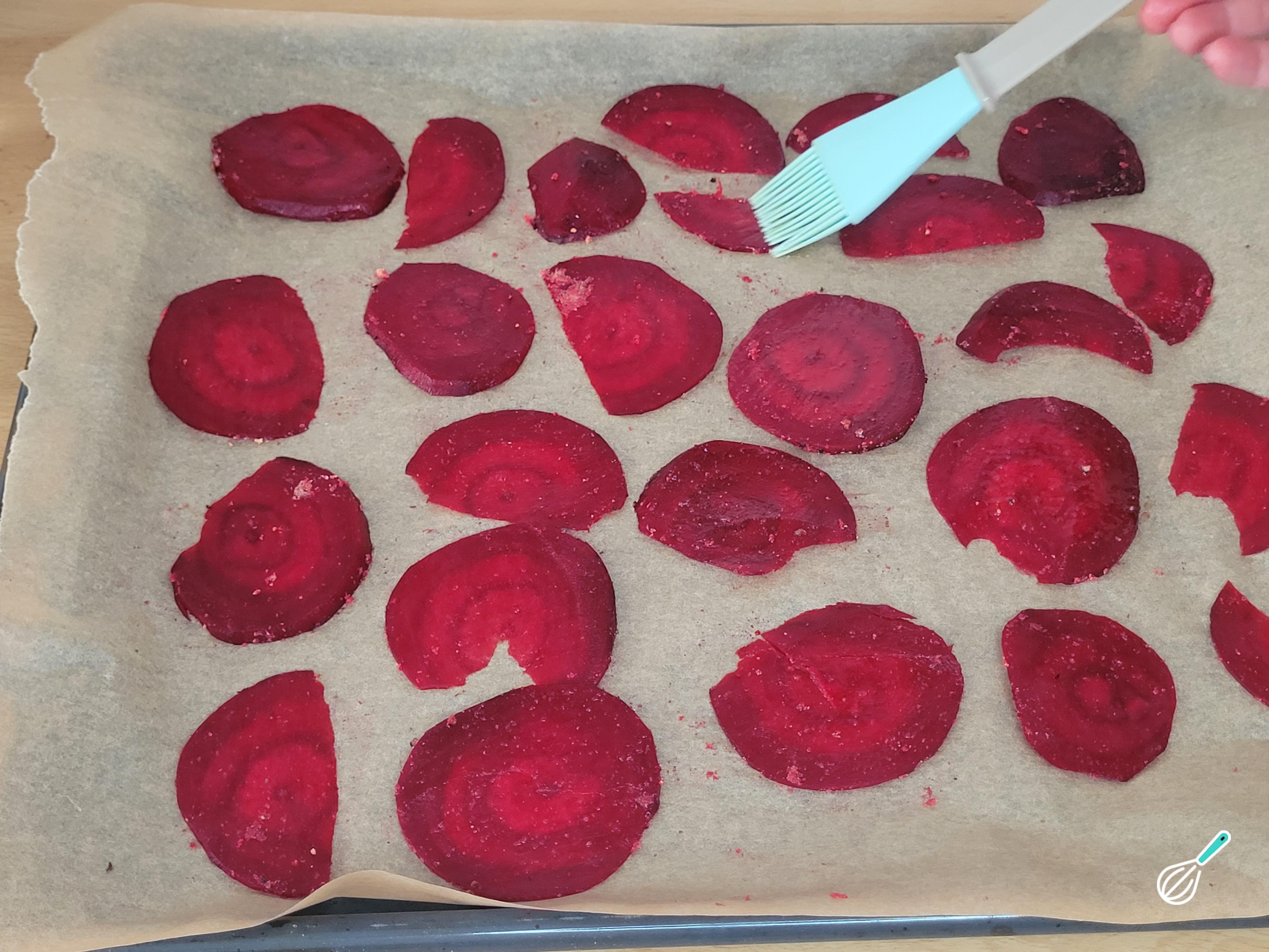 Pincele com azeite de oliva, sem exagerar. Caso contrário, as beterrabas ficarão encharcadas e acabarão não ficando crocantes.