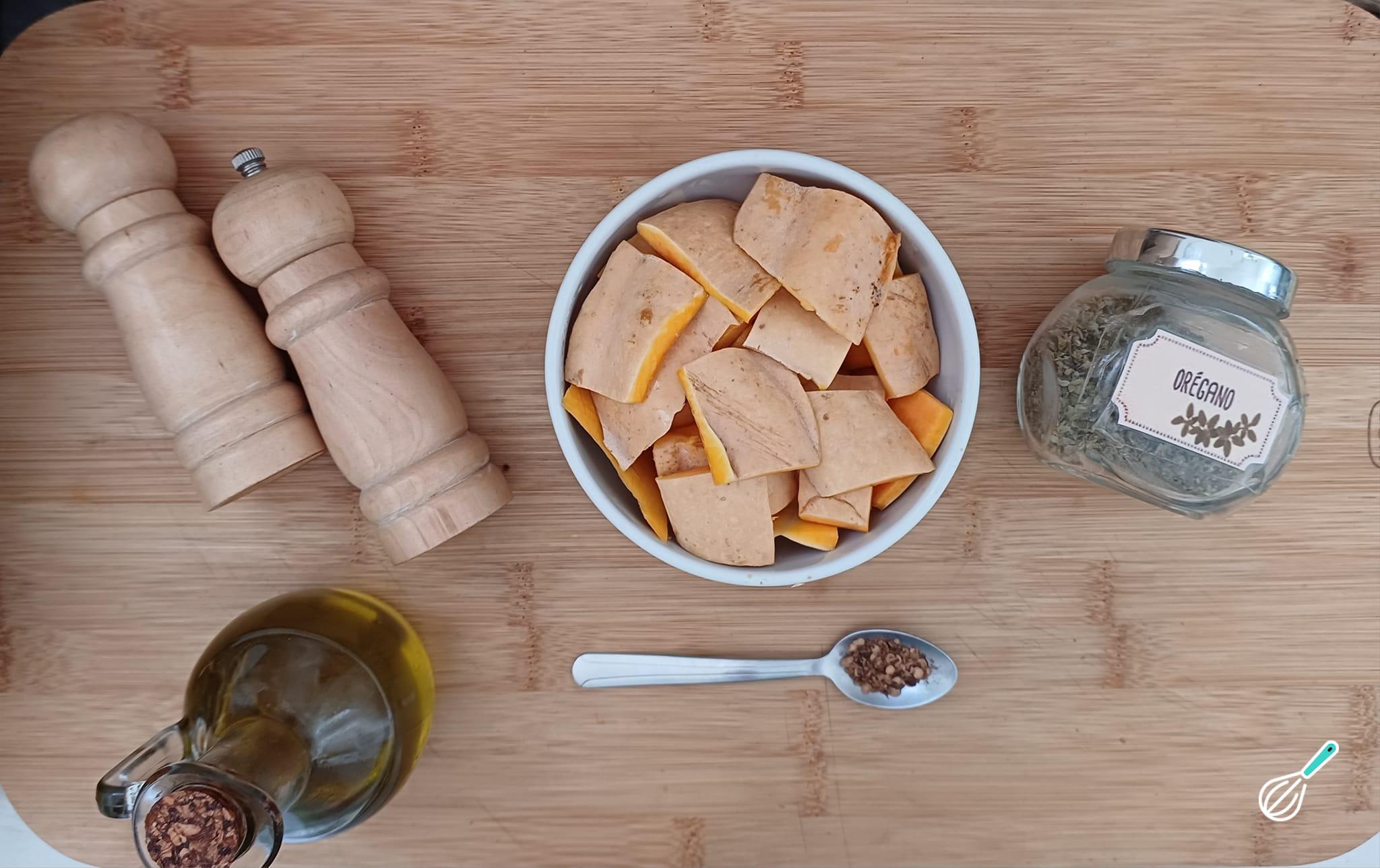 Separe todos os ingredientes para preparar a receita de chips de casca de abóbora.