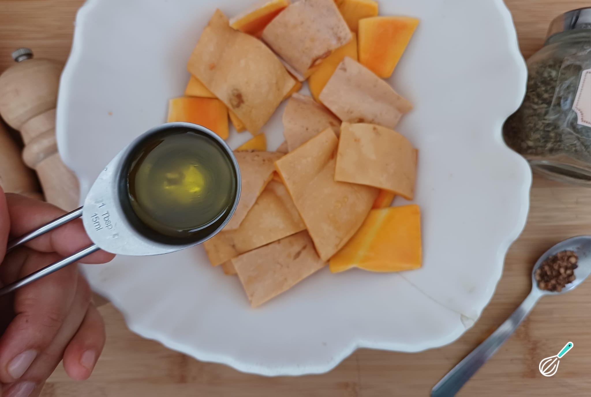 Num bowl, acomode as cascas de abóbora e regue-as com azeite de oliva.