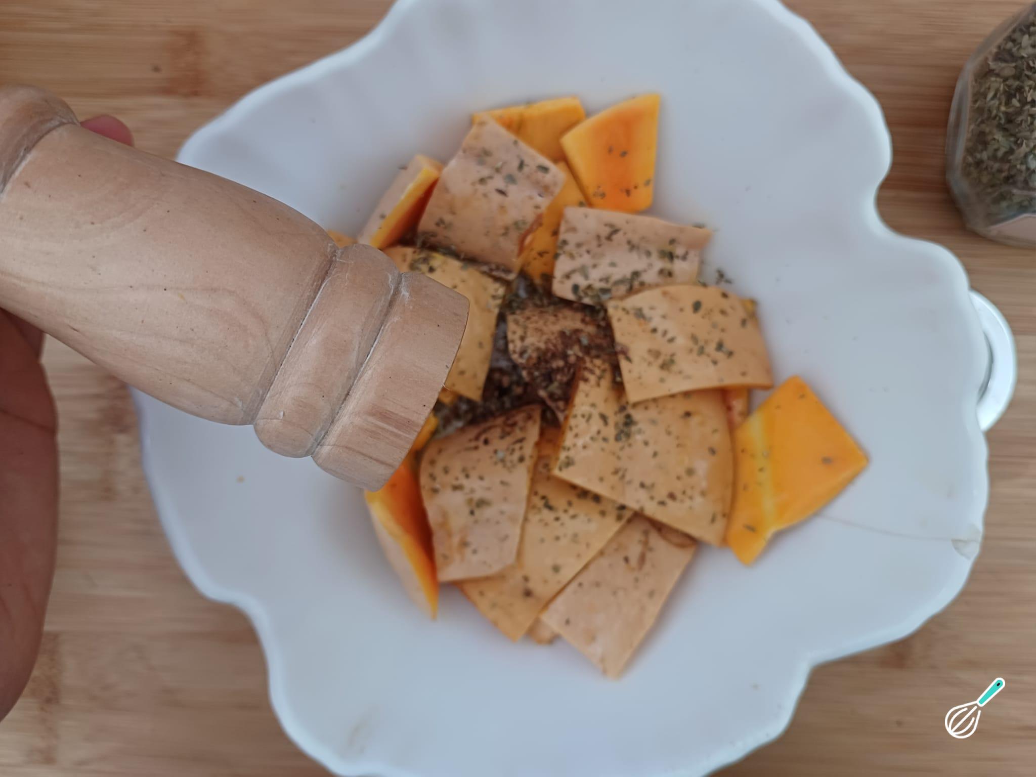 Tempere as cascas de abóbora com sal, pimenta-do-reino e pimenta calabresa, misturando bem em seguida.