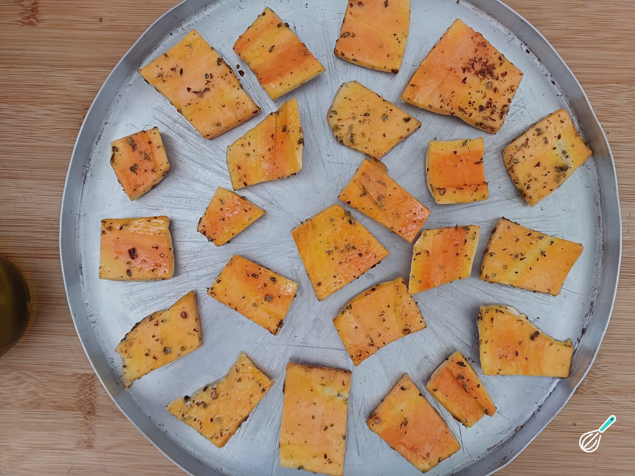 Numa assadeira (sem untar), acomode as cascas da abóbora, primeiro com a parte da polpa voltada para cima.