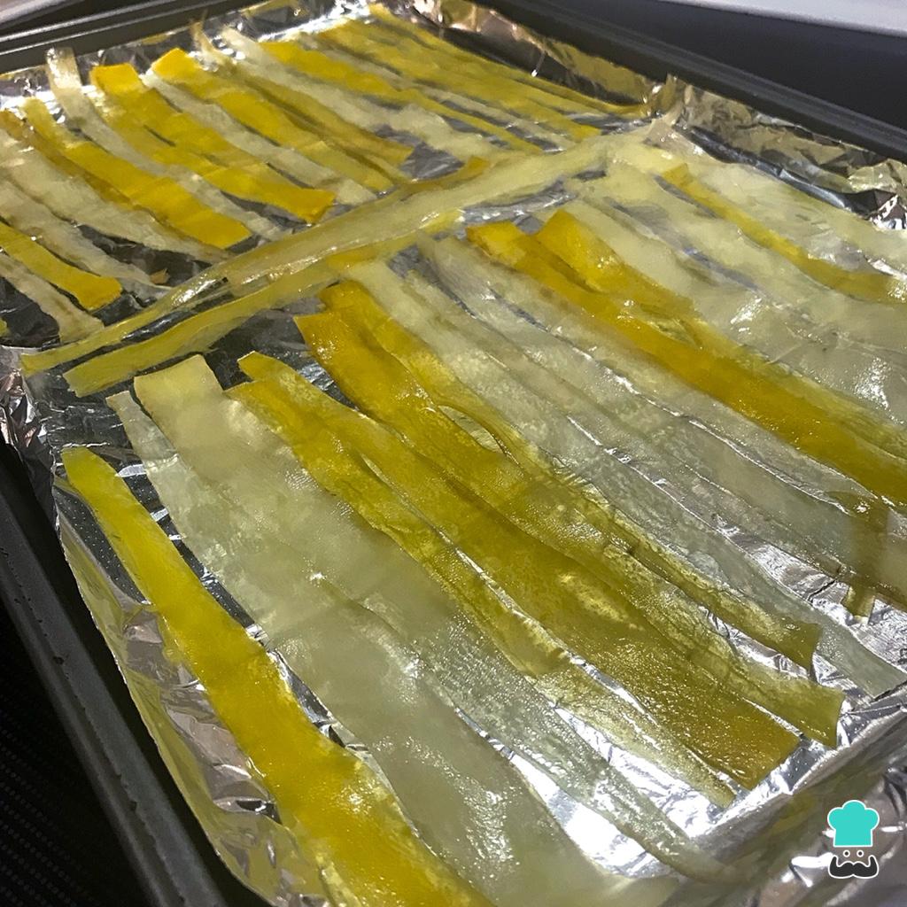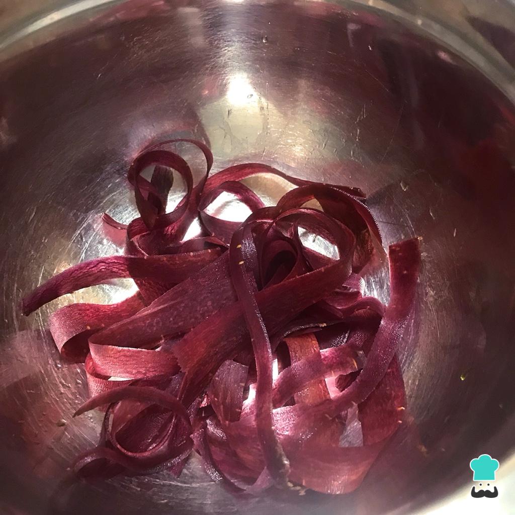Comece descascando a cenoura e depois fazendo filetes com o próprio descascador (deixe bem fininha, quase transparente).