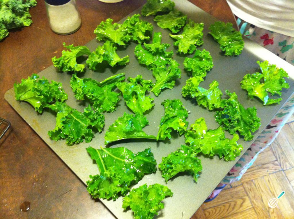 Em seguida separe as folhas do talo, que é muito fibroso e difícil de digerir. Corte as folhas em pedaços com mais ou menos o mesmo tamanho e coloque num bowl. Tempere com o azeite, o sal e outros temperos a gosto (exemplo: alho moído, pimenta do reino, etc) e misture. Pré-aqueça o forno a 180ºC.