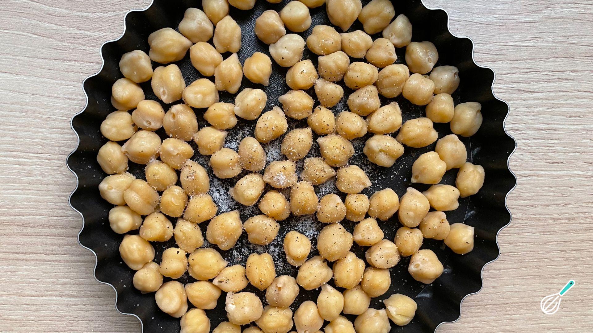 Em seguida coloque o grão de bico em uma assadeira e tempere com azeite, sal, pimenta e cominho a gosto.