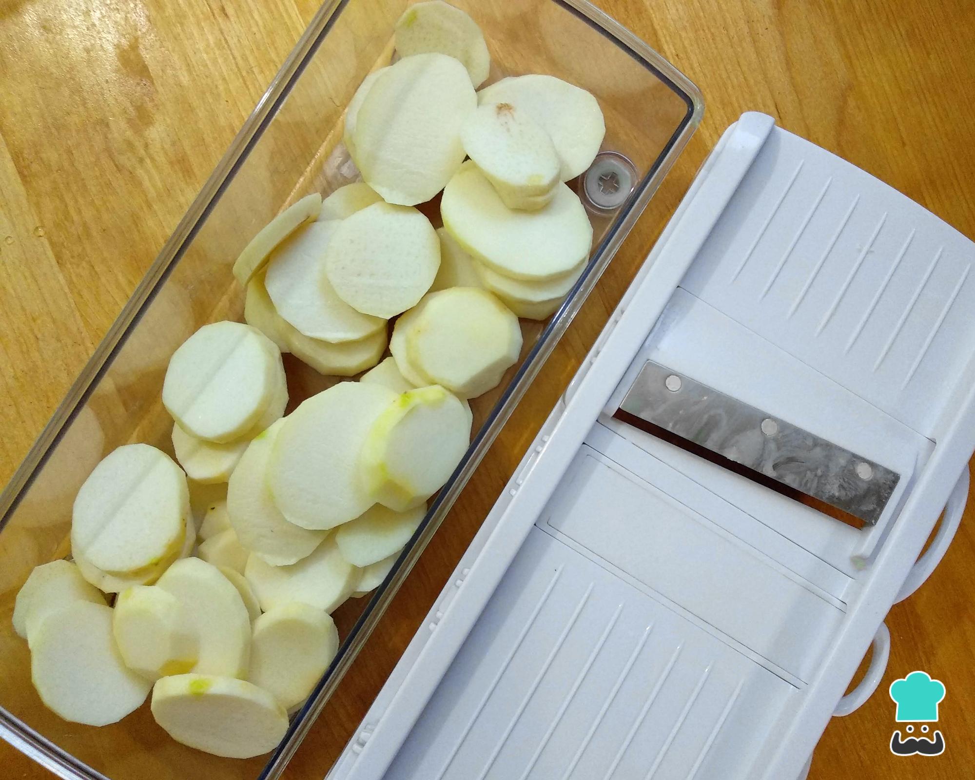 Prepare seus inhames com ou sem casca e corte em rodelas usando uma mandolina.